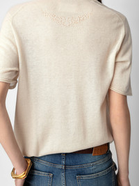 Beige feather cashmere short-sleeved sweater with openwork wings on the back. Description & details - Women’s Judo beige feather cashmere sweater - Openwork wings motifs on the back - Round neckline - Short sleeves, pointelle ZV signature and ribbed trim Model is 178 cm / 5' 10" and is wearing a size S This item is true to size. We recommend buying your usual size. Composition 100% CASHMERE Care - Hand-wash or machine-wash on a 20°C wool cycle with a maximum spin speed of 400 rpm - Do not wring - Air dry flat - Iron inside out at a maximum of 110°C, avoiding any customised details Product code: KWSW01628_JUDO