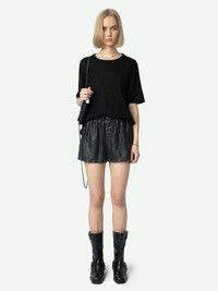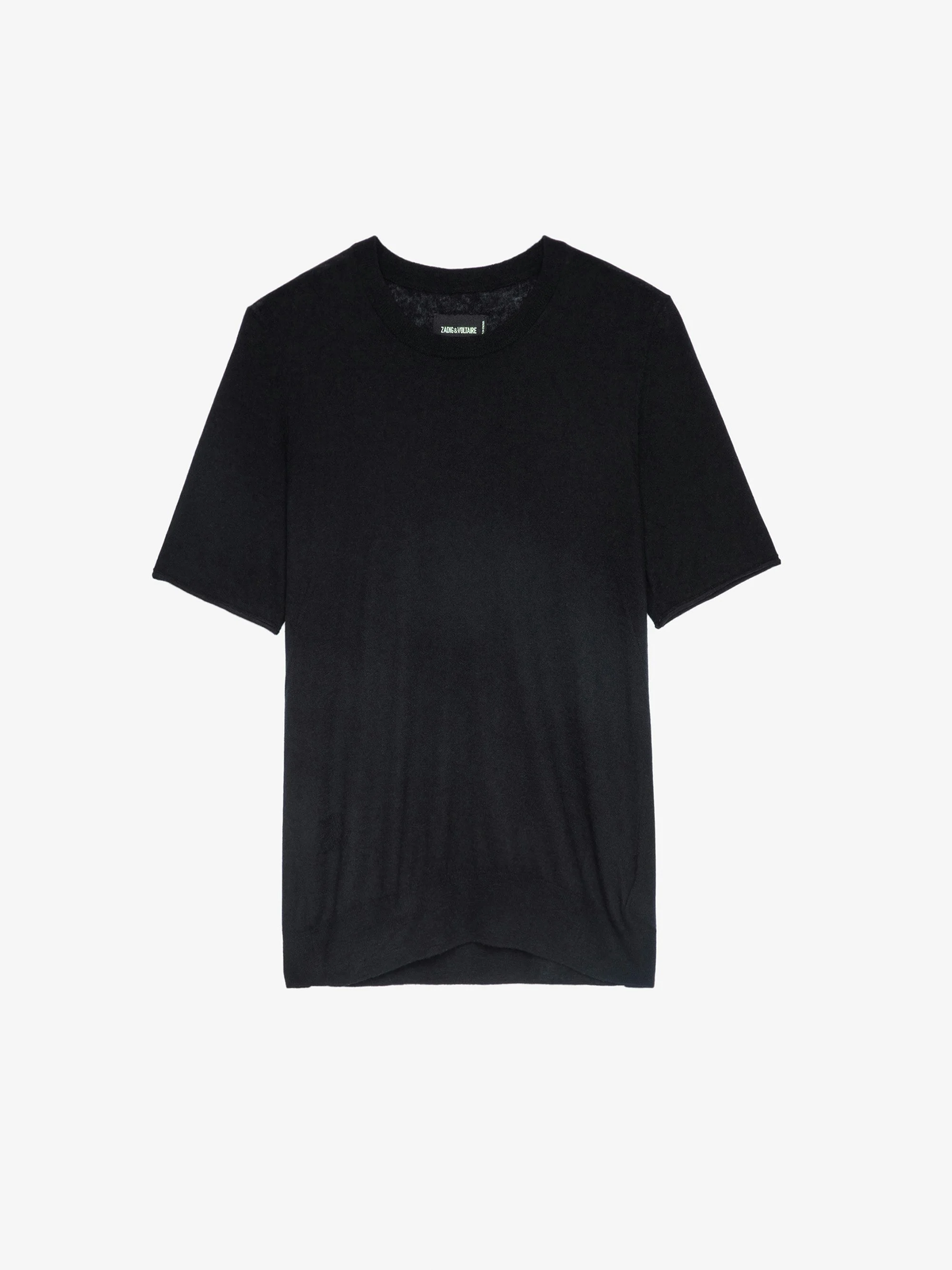 Women's black cashmere pullover with wings on the back Description & details This soft and light short-sleeved sweater in 100% cashmere combines softness and comfort. - Zadig&Voltaire women’s cashmere sweater - Round neck - Short sleeves - Ribbed collar and waist - Topstitching details - Pointelle ZV signature - Naturally warm, feather cashmere is lighter and more delicate than traditional cashmere. The knit is finer, which results in exceptional garments. Model is 175 cm / 5' 8" and is wearing a size S This item is true to size. We recommend buying your usual size. Composition 100% CASHMERE Care Hand or machine wash your knitwear at 68°F in a pillowcase or washing bag. Do not use fabric softener or leave your knit soaking in water. The spin speed must not exceed 400 rpm. Dry flat on a towel away from direct sunlight and heat. Product code: KWSW01524_NOIR