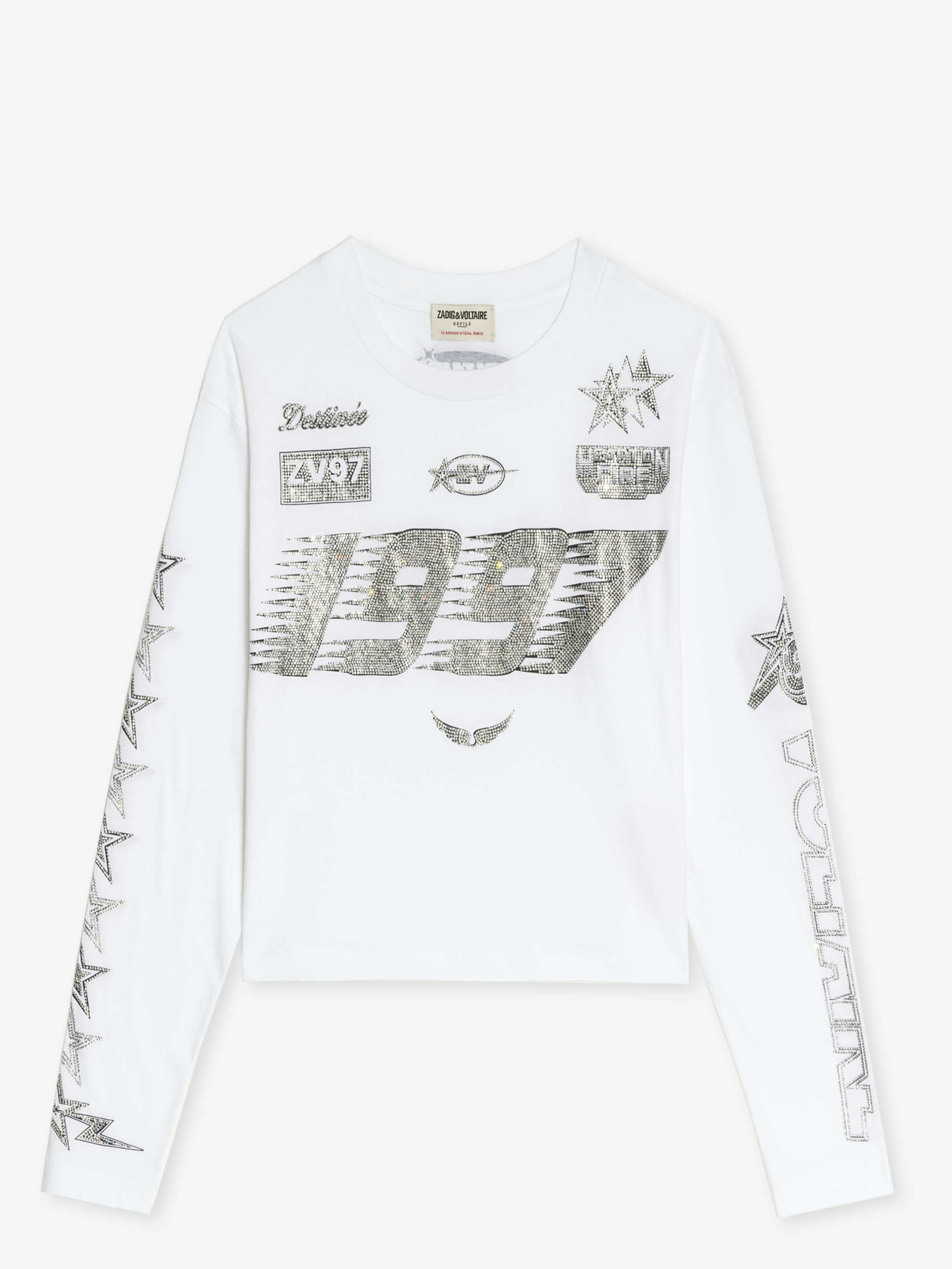 Short long-sleeved t-shirt with round neck featuring print and rhinestones. Description & details - T-shirt in 100% cotton - Print with rhinestones - Long sleeves - Round neck Model is 177 cm / 5' 9" and is wearing a size S This item fits true to size. Choose your usual size. Composition 100% Cotton** Care - Machine-wash inside out on a 30°C delicate cycle with similar colours - Air dry - Iron inside out at a maximum of 110°C, avoiding any customised details Product code: JWTS02836_WHITE