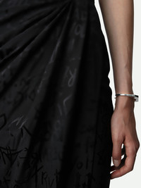 Long draped black silk skirt. Description & details - Women’s long black skirt - Jacquard silk with Zadig&Voltaire manifesto - Draped and slit at front - Zip fastening at the back Model is 170 cm / 5' 6" and is wearing a size 36 If you’re between two sizes, we recommend choosing the larger size. Composition 100% SILK Care Hand-wash or machine-wash your garment at a maximum of 20 °C, in a mesh laundry bag and inside out, with a gentle spin cycle. Air-dry. Iron your garment on a low heat setting or steam from a distance of 20 cm, being particularly careful with customised details. Product code: WWSK00363_NOIR