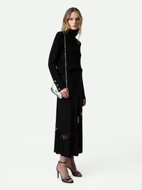 Women’s black silk midi skirt with zip fastening, splits and lace detailing. Description & details - Women’s black silk midi skirt - Lace bands - Zip fastening with side splits - Flared hem Model is 170 cm / 5' 6" and is wearing a size 36 This item is true to size. We recommend buying your usual size. Composition 100% SILK Care - Hand-wash or machine-wash inside out in a mesh laundry bag on a 20°C delicate cycle with a maximum spin speed of 400 rpm - Air dry flat - Iron inside out at a maximum of 110°C Product code: WWSK00364_NOIR