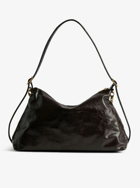 Soft leather bag with vintage effect adorned with a chain and a rhinestone wing. Description & details - Soft vintage effect leather bag - Adjustable and removable handle - Metal chain - Magnetic closure - Interior zipped pocket - Wings signature - Hand or shoulder carry 39 x 24 x 13 cm. Shoulder strap/chain height: 30 cm. Handle height: 13 - 57 cm Composition 100% Cow leather Product code: LWBA04320_BROWNIE