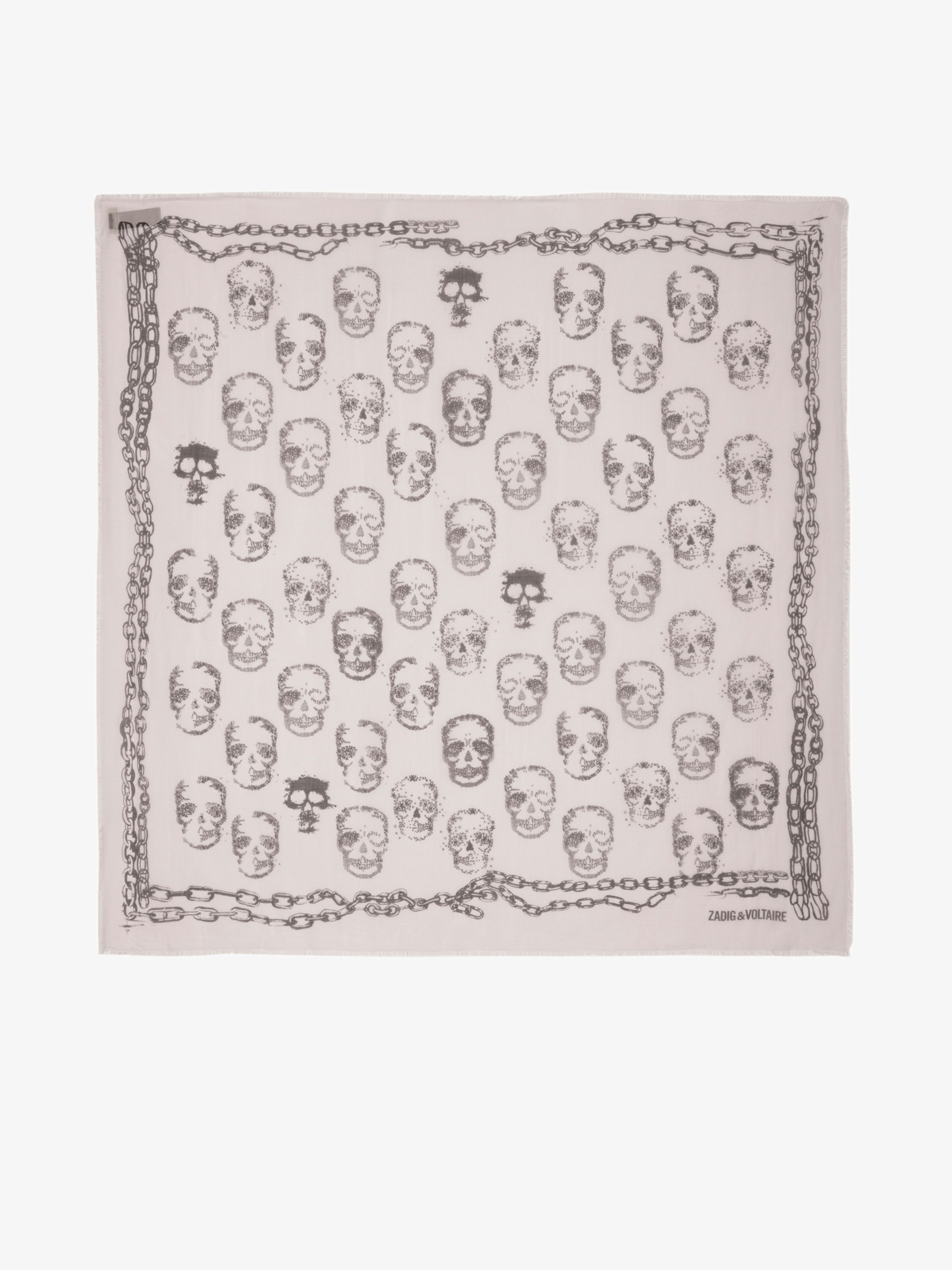 Light pink scarf with skull print. Description & details - Women's pale pink square scarf - Skull, chain, and Zadig&Voltaire signature print - Frayed edges - Made in Italy model 135 x 135 cm Composition 100% Modal Care - Hand-wash or machine-wash inside out in a mesh laundry bag on a 20°C delicate cycle with a maximum spin speed of 400 rpm - Air dry flat - Iron inside out at a maximum of 110°C Product code: OWSC01500_BEBE