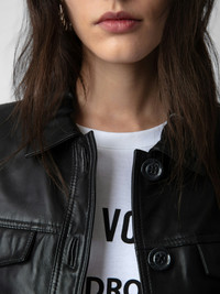 Lambskin button-up jacket. Description & details Our iconic Liam jacket in black leather is a look-defining piece that will structure your silhouette with style. - Zadig&Voltaire Women’s black leather jacket - Shirt collar - Button closure - 2 patch pockets on the chest - 2 welt side pockets Model is 178 cm/5'10" and is wearing a size S Model is 178 cm / 5' 10" and is wearing a size S This item runs small. We recommend buying one size larger than your usual size. Composition 100% LAMBSKIN Care This garment should be cared for by a leather professional. Product code: PWGCU1401F_NOIR