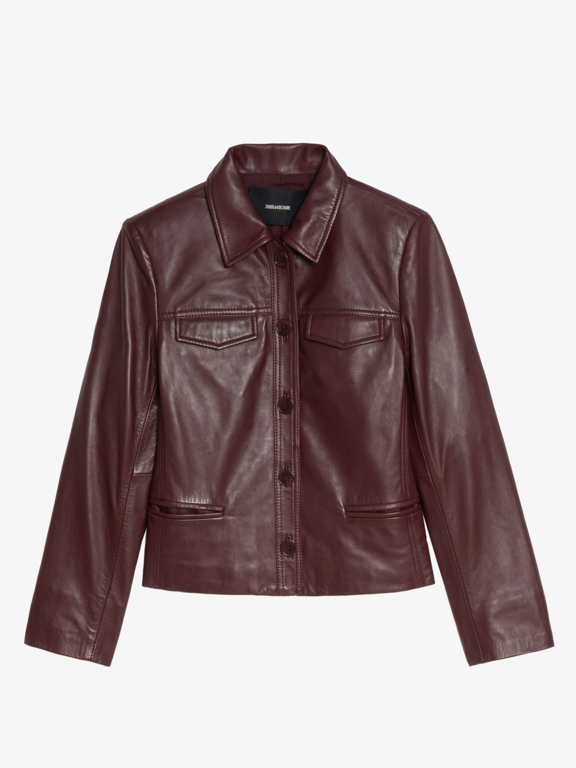 Fitted buttoned jacket with embossed wings in smooth leather. Description & details - Fitted leather jacket - Classic collar - Button closure - 2 side piped pockets and 2 patch chest pockets - Long sleeves with shoulder pads - Fitted cut Model is 177 cm / 5' 9" and is wearing a size S If you’re between two sizes, we recommend choosing the larger size. Composition 100% Lambskin Care This garment should be cared for by a leather professional. Product code: RWOW01244_BURGUNDY