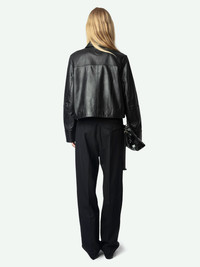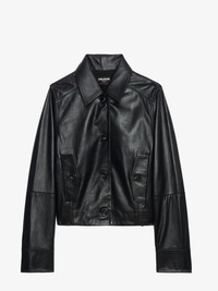 Rock-infused elegance meets effortless cool. This cropped black leather jacket redefines rebellion with its structured silhouette, sleek button-up front, and utilitarian pocket details. A versatile staple that pairs seamlessly with tailored pants or distressed denim—wear it your way, with attitude. Description & details - Women's short black smooth leather jacket - Pointed collar and button fastening - 2 piped pockets - Long sleeves - Topstitching and embossed signature metal wings on the back Model is 177 cm / 5' 9" and is wearing a size S This item is true to size. We recommend buying your usual size. Composition 100% Lambskin Care This garment should be cared for by a leather professional. Product code: RWOW01247_BLACK