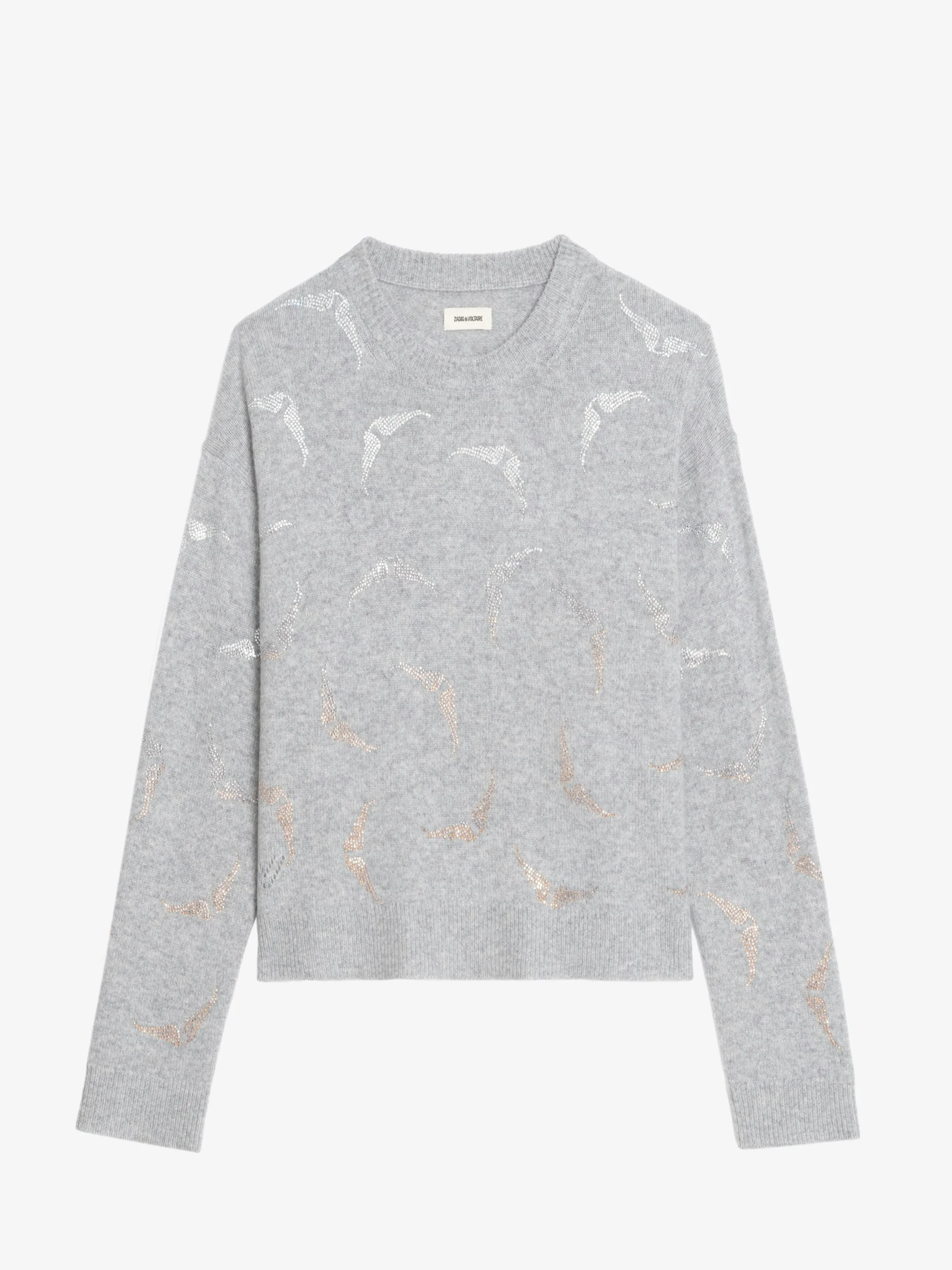 Round neck sweater with rhinestone wings. Description & details - Sweater in 100% cashmere - Wing and rhinestone customization - Round neckline - Long sleeves Model is 178 cm / 5' 10" and is wearing a size S This item has a loose fit. For a more fitted look, choose one size down from your usual size. Composition 100% Cashmere Care - Hand-wash or machine-wash on a 20°C wool cycle with a maximum spin speed of 400 rpm - Do not wring - Air dry flat - Iron inside out at a maximum of 110°C, avoiding any customised details Product code: KWSW02921_GRIS CHINE CLAI