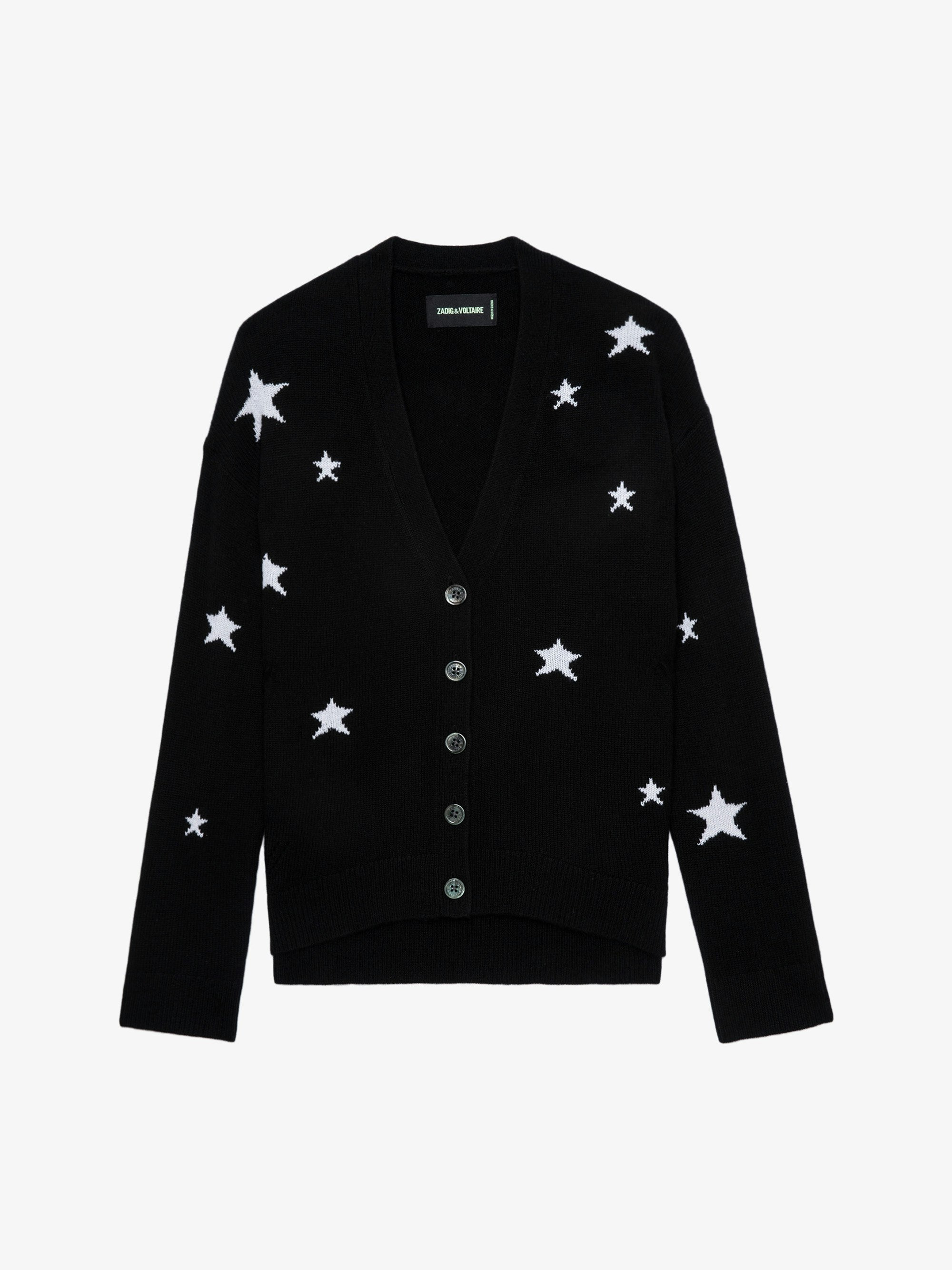 Women’s black cashmere button front cardigan with contrasting star motifs Description & details Studded with stars in intarsia jacquard, this long-sleeved button front 100% cashmere cardigan is infinitely soft. - Zadig&Voltaire women’s black cashmere cardigan - Contrasting star motifs - V neckline - Button front - Long sleeves - Ribbed cuffs and hem - 100% cashmere Model is 179 cm/5'87" and is wearing a size S Model is 170 cm / 5' 6" and is wearing a size S This item is true to size. We recommend buying your usual size. Composition 100% CASHMERE* Care Hand or machine wash your knitwear at 68°F in a pillowcase or washing bag. Do not use fabric softener or leave your knit soaking in water. The spin speed must not exceed 400 rpm. Dry flat on a towel away from direct sunlight and heat. Product code: KWCA00001_NOIR