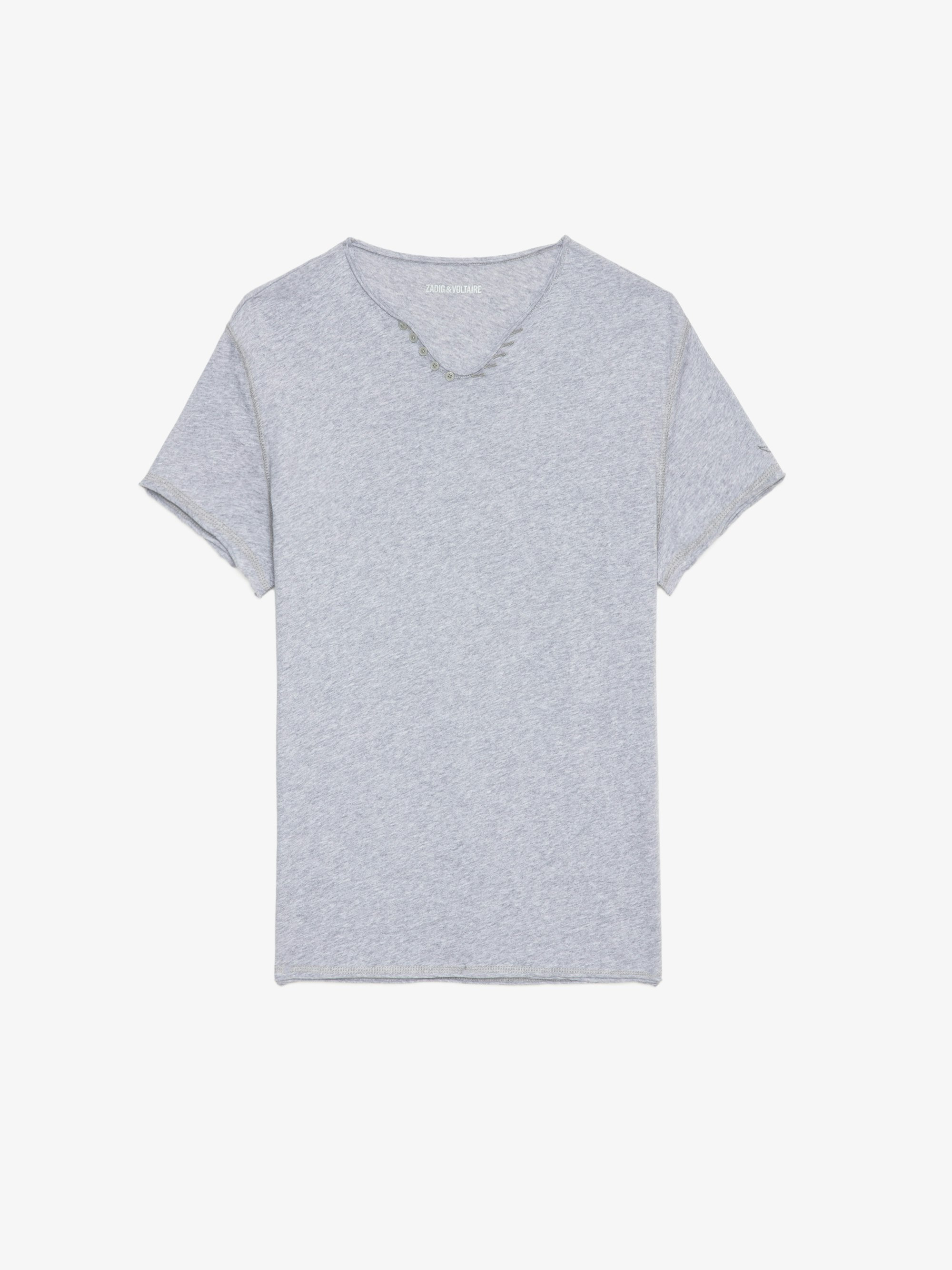 Henley t-shirt in grey marl organic cotton with short sleeves. Description & details - Henley t-shirt in heather grey organic cotton for men - 5-button henley t-shirt collar - Short sleeves with raw edges - Made in Portugal Model is 184 cm / 6' 0" and is wearing a size S This item is true to size. We recommend buying your usual size. Composition 100% Cotton* Care - Machine-wash inside out on a 30°C delicate cycle with similar colours - Air dry - Iron inside out at a maximum of 110°C, avoiding any customised details Product code: JMTN01631_GRIS CHINE