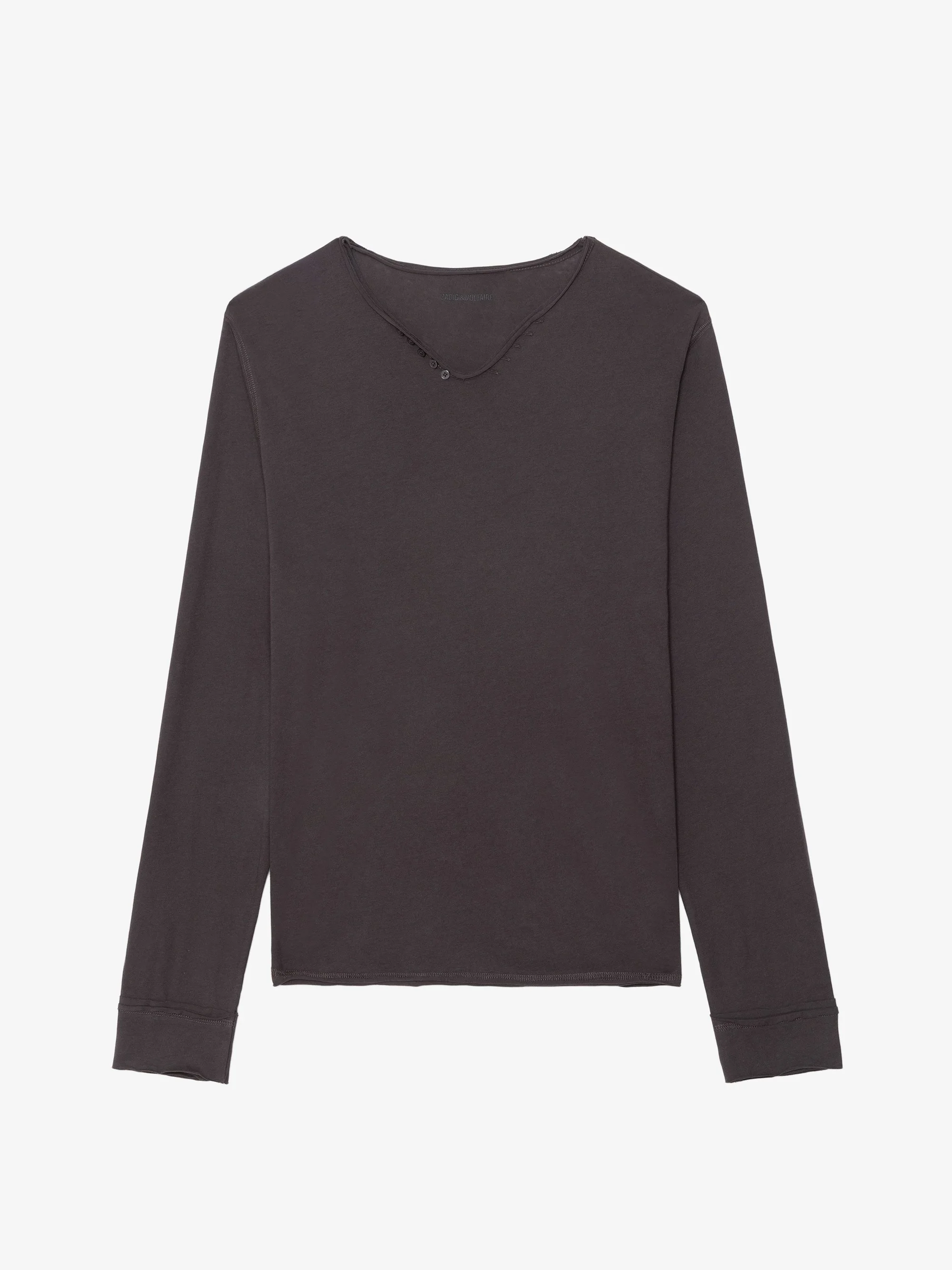 Long-sleeved henley t-shirt with print on the back. Description & details - Henley t-shirt in 100% cotton - Skull flock print on the back - Tunisian collar with 5 buttons - Long sleeves - Straight fit Model is 188 cm / 6' 2" and is wearing a size M This item fits true to size. Choose your usual size. Composition 100% Cotton* Care - Machine-wash inside out on a 30°C delicate cycle with similar colours - Air dry - Iron inside out at a maximum of 110°C, avoiding any customised details Product code: JMTN01660_CARBONE
