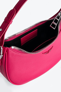 Women’s half-moon bag in pink grained leather with a short handle, shoulder strap, chain and signature wings. Description & details - Women’s Moonrock bag in Podium pink grained leather - Black cotton lining - Short leather handle, adjustable Zadig&Voltaire branded nylon shoulder strap and removable metal chain - Signature wings with tone-on-tone diamanté embellishment - Inside patch pocket - Zip closure - Carry by hand, over the shoulder or across the body Width x Height x Depth: 9.1 x 7.1 x 2.6 in. Handle height: 7.7 in. Chain strap drop: 14.2 in. Ajustable shoulder strap drop: 11.8 - 21.3 in. Composition 100% COW LEATHER Care Do not expose your item to a source of heat or to sunlight for a prolonged period. In the event of accidental exposure to water, leave your item to dry at room temperature, away from direct light. Avoid routinely overloading your handbag or clutch. To prolong its life, store your item in a dust bag and pad it with tissue paper to maintain its shape. To maintain the shine of your smooth or grained leather item, use a leather cream or polish. Product code: LWBA02401_PODIUM