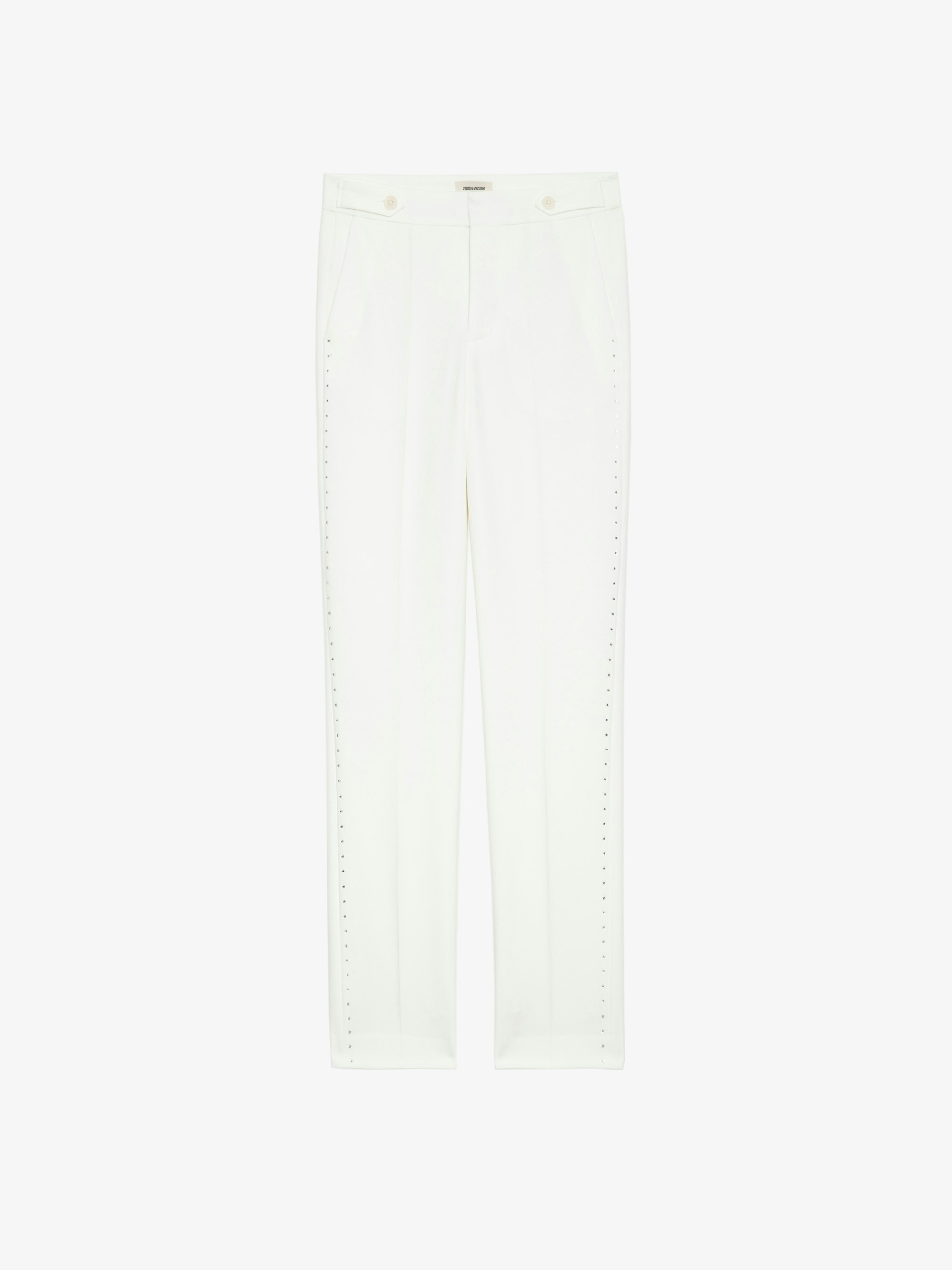 Straight-leg tailored pants with pockets and rhinestones. Description & details - Women's white straight-leg suit pants - Rhinestones down legs - Zip fastening with hook and button tabs at the waist - 2 side pockets and 2 welt pockets at the back This item fits true to size. Choose your usual size. Composition 69% Polyester 23% Viscose 8% Elasthanne Product code: WWPA01847_JUDO