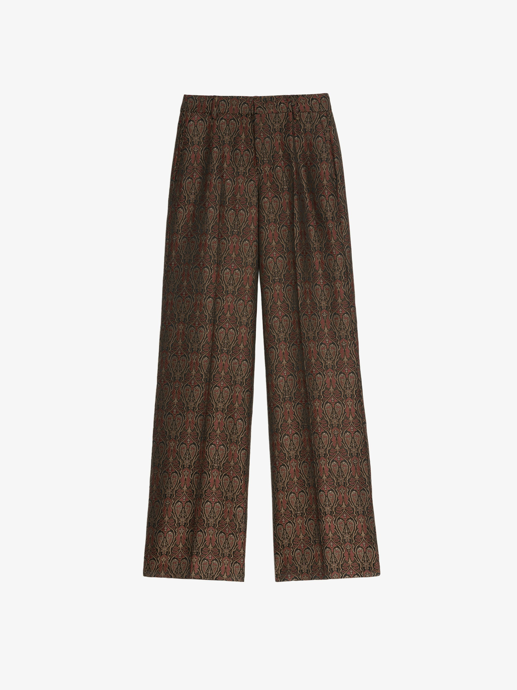 Straight-cut loose tailored pants in paisley jacquard. Description & details - Straight-cut tailored pants in jacquard - Paisley pattern - Italian pockets and piped pockets - Button fastening and belt loops - Loose fit - High waist Model is 179 cm / 5' 10" and is wearing a size S This item fits true to size. Choose your usual size. Composition 48% Viscose** 34% Polyester** 18% Cotton** Care - Hand-wash or machine-wash on a 20°C wool cycle with a maximum spin speed of 400 rpm - Do not wring - Air dry flat - Iron inside out at a maximum of 110°C, avoiding any customised details Product code: WWPA01869_BLACK
