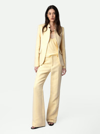 Light yellow linen flared tailored pants with pockets and pleats. Description & details - Women’s Cedra light yellow linen flared tailored pants - Lengthwise pleats - 5 pockets and belt loops at the waist - Made in Portugal Model is 178 cm / 5' 10" and is wearing a size S This item is true to size. We recommend buying your usual size. Composition 61% COTTON 36% LINEN 2% POLYESTER 1% POLYAMID Care - Hand-wash or machine-wash inside out in a mesh laundry bag on a 20°C delicate cycle with a maximum spin speed of 400 rpm - Air dry flat - Iron inside out at a maximum of 110°C Product code: WWPA00792_CEDRA