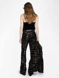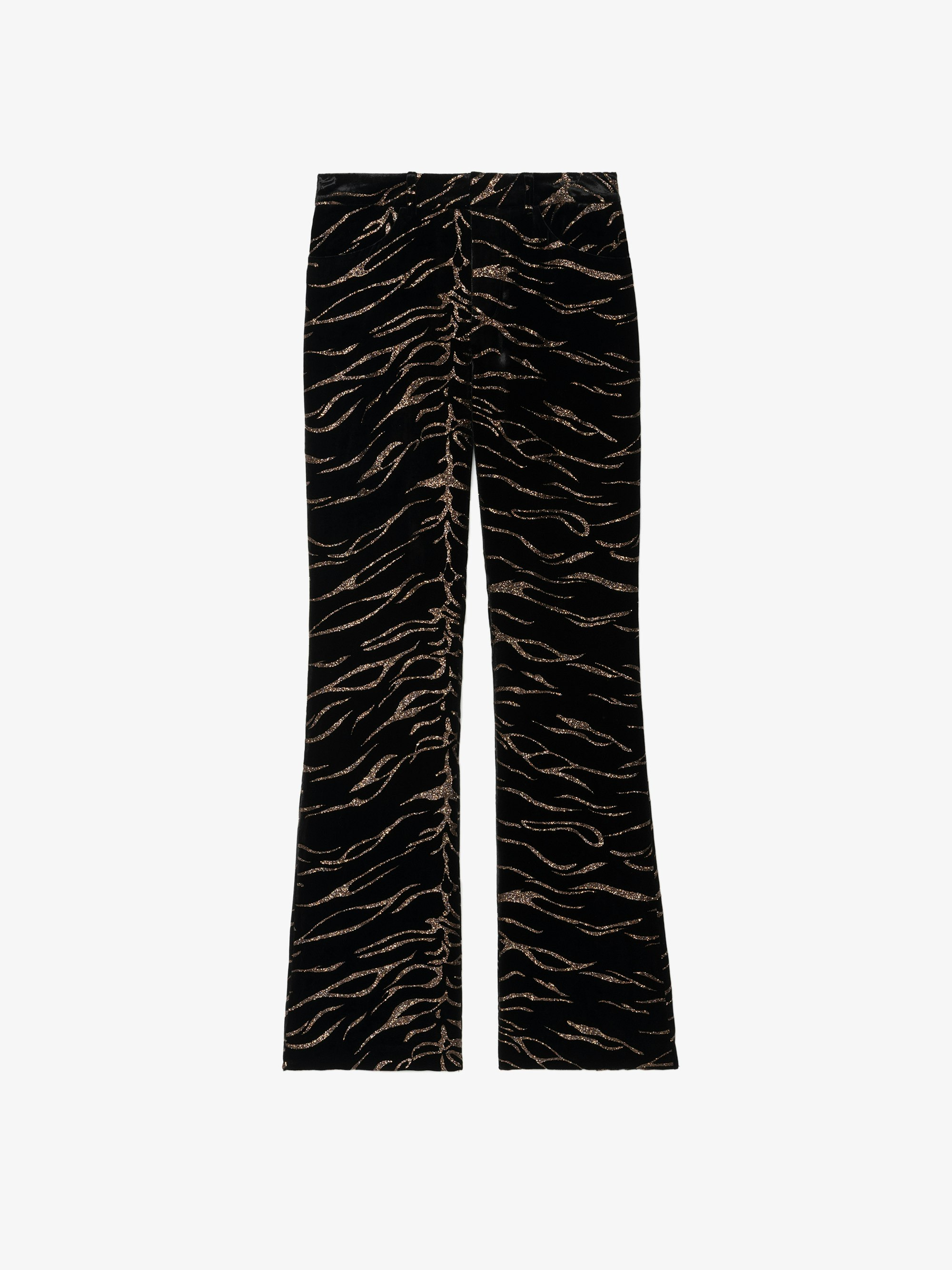 Wide straight tailored pants in tiger sequin velvet. Description & details - Wide pants in velvet - Tiger sequins - Zip and hook fastening and belt loops - 2 side pockets and 2 piped pockets at back - Regular fit - High waisted Model is 179 cm / 5' 10" and is wearing a size S This item fits true to size. Choose your usual size. Composition 82% Viscose** 18% Silk Care - Hand-wash or machine-wash on a 20°C wool cycle with a maximum spin speed of 400 rpm - Do not wring - Air dry flat - Iron inside out at a maximum of 110°C, avoiding any customised details Product code: WWPA01870_BLACK