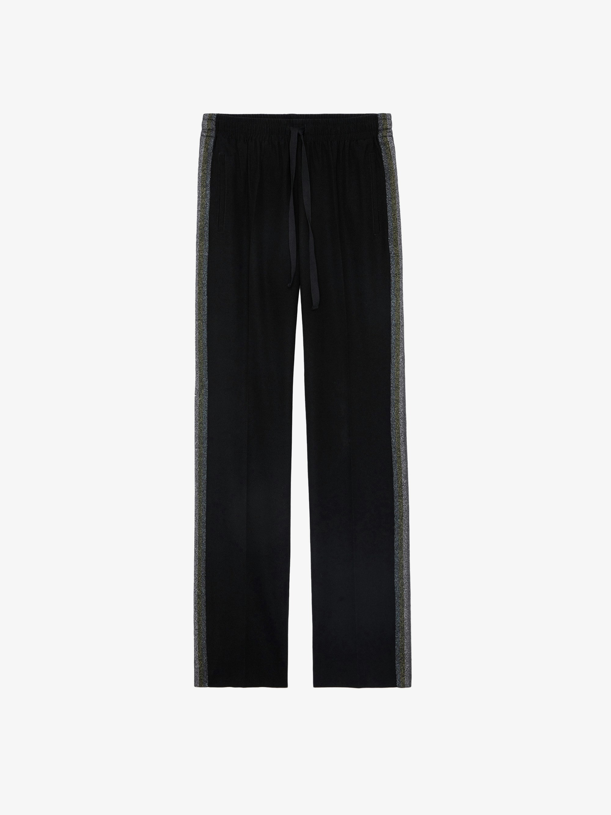 Women's black pants with glittery side bands Description & details An absolute must-have, these laid-back pants with a drawstring waist and side pockets sport colourful glittery side bands. - Women's Zadig&Voltaire black unstructured pants - Glittery side bands - Drawstring waist - 2 pockets Model is 177 cm / 5' 9" and is wearing a size 36 This item is true to size. We recommend buying your usual size. Composition 82% ACETATE 18% POLYESTER Care - Hand-wash or machine-wash inside out in a mesh laundry bag on a 20°C delicate cycle with a maximum spin speed of 400 rpm - Air dry flat - Iron inside out at a maximum of 110°C Product code: WWPA00784_NOIR