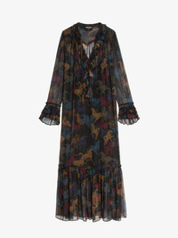 Long draped dress in printed muslin, long sleeves. Description & details - Long dress in muslin - Horse print - Deep neckline with ruffles and drawstring - Long fluid sleeves with ruffles - Fluid transparent cut with slip dress Model is 179 cm / 5' 10" and is wearing a size S This item fits true to size. Choose your usual size. Composition 100% Viscose** Care - Hand-wash or machine-wash inside out in a mesh laundry bag on a 20°C delicate cycle with a maximum spin speed of 400 rpm - Air dry flat - Iron inside out at a maximum of 110°C Product code: WWDR02564_DARK CHOCOLATE