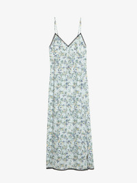 Long lingerie-inspired dress in printed viscose, with slit, adjustable straps, wing embroidery on the back and lace. Description & details - Long lingerie-inspired dress - Floral print - Lace trim and wing embroidery on the back - V-neck - Thin adjustable straps - Slit skirt Model is 175 cm / 5' 8" and is wearing a size S This item fits true to size. Choose your usual size. Composition 100% Viscose Care - Hand-wash or machine-wash inside out in a mesh laundry bag on a 20°C delicate cycle with a maximum spin speed of 400 rpm - Air dry flat - Iron inside out at a maximum of 110°C Product code: WWDR02633_CLOUD