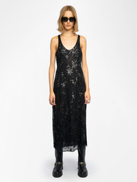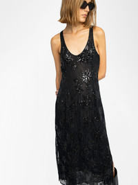 Long lingerie-inspired sleeveless dress in lace embroidered with sequins and pearls. Description & details - Long sleeveless lingerie-inspired dress - Lace embroidered with sequins and pearls - Round neckline - Sleeveless - Fluid cut Model is 177 cm / 5' 9" and is wearing a size S This item fits true to size. Choose your usual size. Composition 100% Polyamide** Care This garment should be dry-cleaned only. Product code: WWDR02548_BLACK