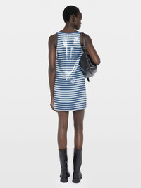 - Sleeveless short dress - Striped print and sequins - U neckline - Fluid fit Description & details - Sleeveless short dress - Striped print and sequins - U neckline - Fluid fit Model is 181 cm / 5' 11" and is wearing a size S This item fits true to size. Choose your usual size. Composition 100% Polyester** Care This garment should be dry-cleaned only. Product code: WWDR02624_SKY