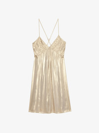 This lingerie-inspired mini dress is crafted from luxurious satin, featuring delicate pleats that enhance its fluid silhouette. The adjustable cross-over straps ensure a personalized fit, while the rich gold hue adds a touch of opulence. Description & details - Short pleated lingerie-inspired dress in satin - Thin, adjustable cross-over straps - Gathered front detail at chest level - Front slit Model is 171 cm / 5' 7" and is wearing a size S This item is true to size. We recommend buying your usual size. Composition 100% Polyester** Care - Hand-wash or machine-wash inside out in a mesh laundry bag on a 20°C delicate cycle with a maximum spin speed of 400 rpm - Air dry flat - Iron inside out at a maximum of 110°C Product code: WWDR02551_GOLD