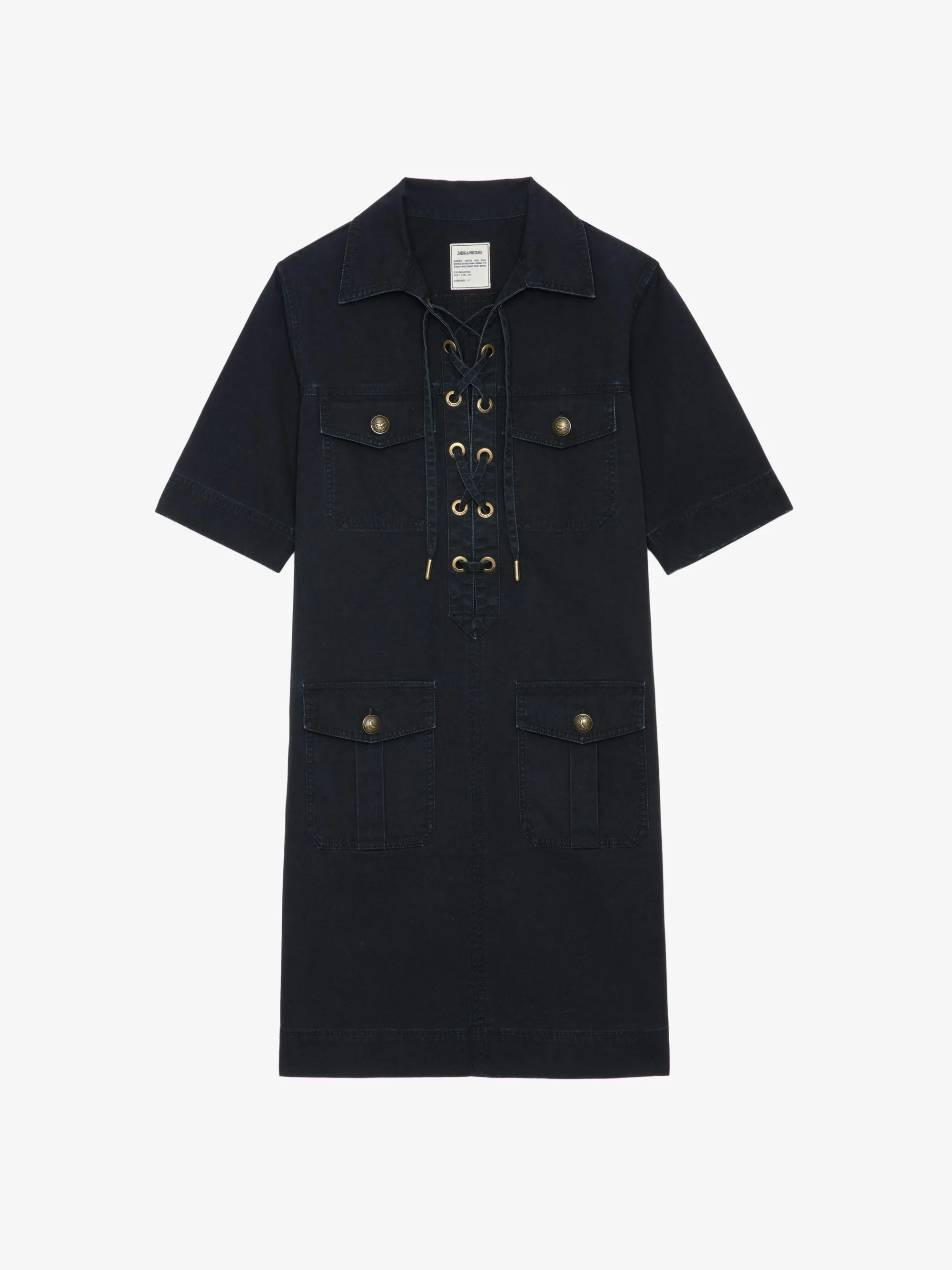 Short military-inspired dress in washed cotton, short sleeves, laced neckline, and multiple pockets. Description & details - Short military-inspired dress in washed cotton - Shirt collar and laced neckline - 4 pockets with buttoned flaps - Short sleeves - Slightly flared skirt Model is 176 cm / 5' 9" and is wearing a size S This item is true to size. We recommend buying your usual size. Composition 100% Cotton** Care - Machine-wash inside out on a 30°C delicate cycle with similar colours - Air dry - Iron inside out at a maximum of 110°C, avoiding any customised details Product code: WWDR02512_BLACK