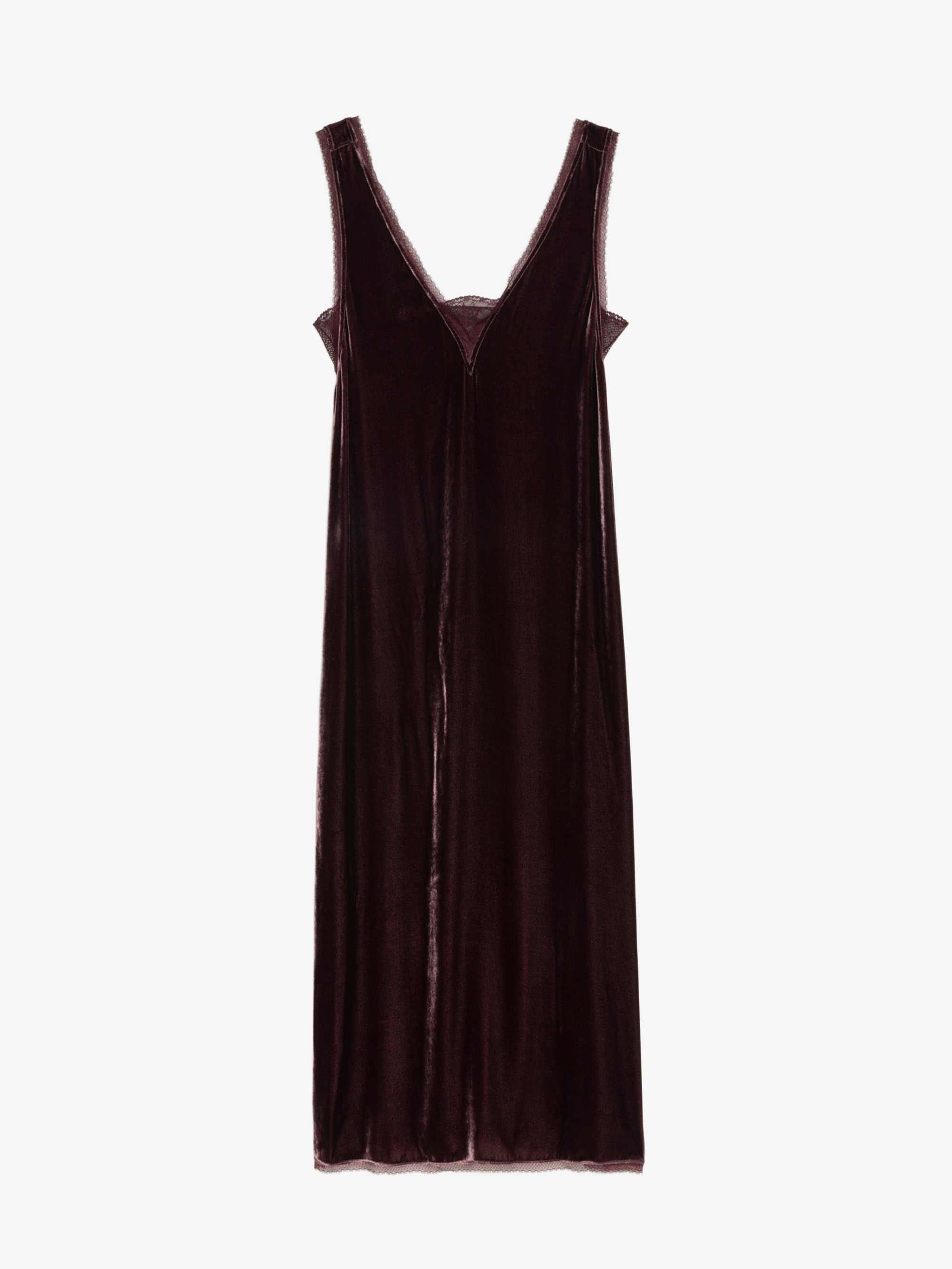 Long dress in plain velvet, lingerie spirit with French lace. Description & details - Long lingerie-style dress in velvet - Deep V-neckline with lace details on front and back - Straps with French lace details - Fluid cut This French lace was made by Sophie Hallette exclusively for Zadig&Voltaire. Model is 179 cm / 5' 10" and is wearing a size S This item fits true to size. Choose your usual size. Composition 80% Viscose** 20% Silk Care - Hand-wash or machine-wash inside out in a mesh laundry bag on a 20°C delicate cycle with a maximum spin speed of 400 rpm - Air dry flat - Iron inside out at a maximum of 110°C Product code: WWDR02571_BURGUNDY