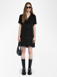 Short dress in horses jacquard silk, lingerie spirit, short sleeves, removable belt and French lace. Description & details - Short lingerie-style dress in 100% silk - Horses jacquard pattern - V-neck - Short sleeves - Removable belt - Lace details This French lace was made by Sophie Hallette exclusively for Zadig&Voltaire. Model is 178 cm / 5' 10" and is wearing a size S This item fits true to size. Choose your usual size. Composition 100% Silk Care - Hand-wash or machine-wash inside out in a mesh laundry bag on a 20°C delicate cycle with a maximum spin speed of 400 rpm - Air dry flat - Iron inside out at a maximum of 110°C Product code: WWDR02588_BLACK