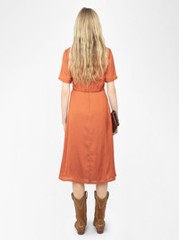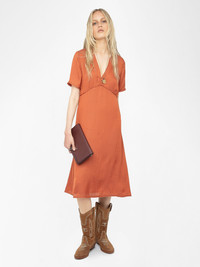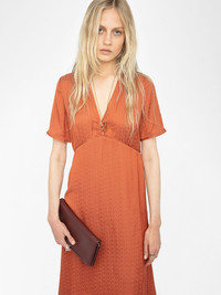 Mid-length dress in ZV jacquard satin, short sleeves and buttoned neckline. Description & details - Mid-length jacquard satin dress - Buttoned V-neck - Short sleeves - Back zip fastening - Fluid fit Model is 175 cm / 5' 8" and is wearing a size S This item fits true to size. Choose your usual size. Composition 65% Polyester** 35% Polyester Care - Hand-wash or machine-wash inside out in a mesh laundry bag on a 20°C delicate cycle with a maximum spin speed of 400 rpm - Air dry flat - Iron inside out at a maximum of 110°C Product code: WWDR02583_SIENNA