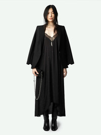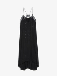 Black maxi lingerie-style diamante dress with all-over diamante, thin straps, and lace-trimmed neckline. Description & details - Women's black lingerie-style maxi diamante dress - All-over diamante and lace strips - Diamante dress with V-neckline - Thin non-adjustable straps - Asymmetrical on the bottom This French lace was made by Sophie Hallette exclusively for Zadig&Voltaire. Model is 178 cm / 5' 10" and is wearing a size S This item is true to size. We recommend buying your usual size. Composition 100% Viscose Care - Hand-wash or machine-wash inside out in a mesh laundry bag on a 20°C delicate cycle with a maximum spin speed of 400 rpm - Air dry flat - Iron inside out at a maximum of 110°C Product code: WWDR01387_STONE