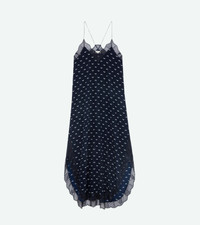 Women's long navy blue silk dress with wing motif. Description & details - Women’s long flowing navy blue dress - Silk embellished with contrasting wing motif - V neckline - Thin non-adjustable straps and slits at the hem - Contrasting lace strips Model is 175 cm / 5' 8" and is wearing a size S This item is true to size. We recommend buying your usual size. Composition 100% SILK Care Hand-wash or machine-wash your garment at a maximum of 68°F, in a mesh laundry bag and inside out, with a gentle spin cycle. Air-dry. Iron your garment on a low heat setting or steam from a distance of 8 in, being particularly careful with customized details. Product code: WWDR01251_MARINE