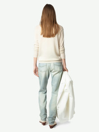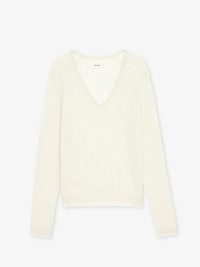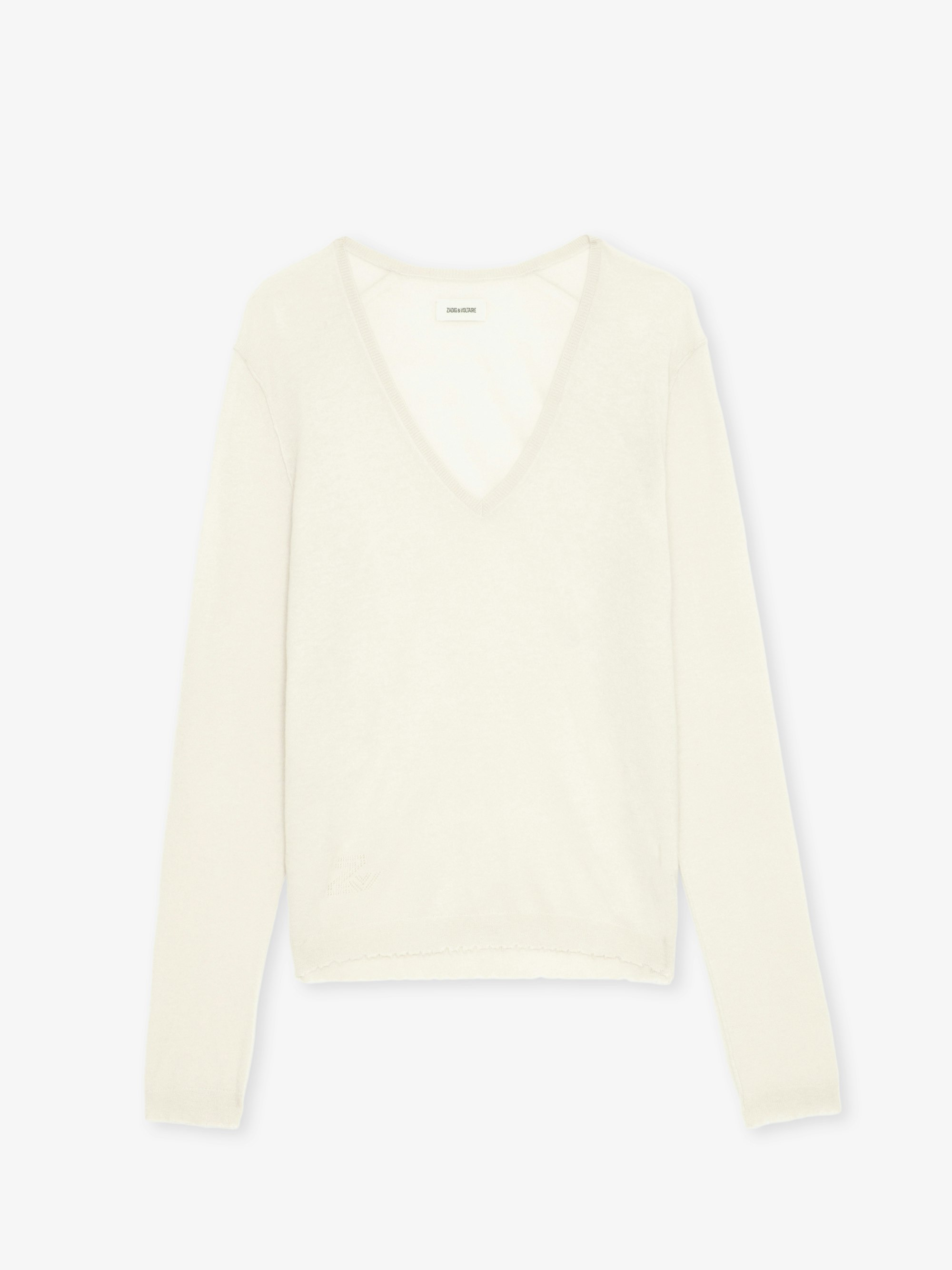 Long-sleeved V-neck sweater. Description & details - Sweater in 100% featherweight cashmere - V-neck - Long sleeves, ribbed edges with worn effect and ZV pointelle signature - Naturally warm, featherweight cashmere is lighter and more delicate than classic cashmere. It is knitted more finely, making it an exceptional piece. Model is 176 cm / 5' 9" and is wearing a size S This item is true to size. We recommend buying your usual size. Composition 100% Cashmere Care - Hand-wash or machine-wash on a 20°C wool cycle with a maximum spin speed of 400 rpm - Do not wring - Air dry flat - Iron inside out at a maximum of 110°C, avoiding any customised details Product code: KWSW01661_ECRU