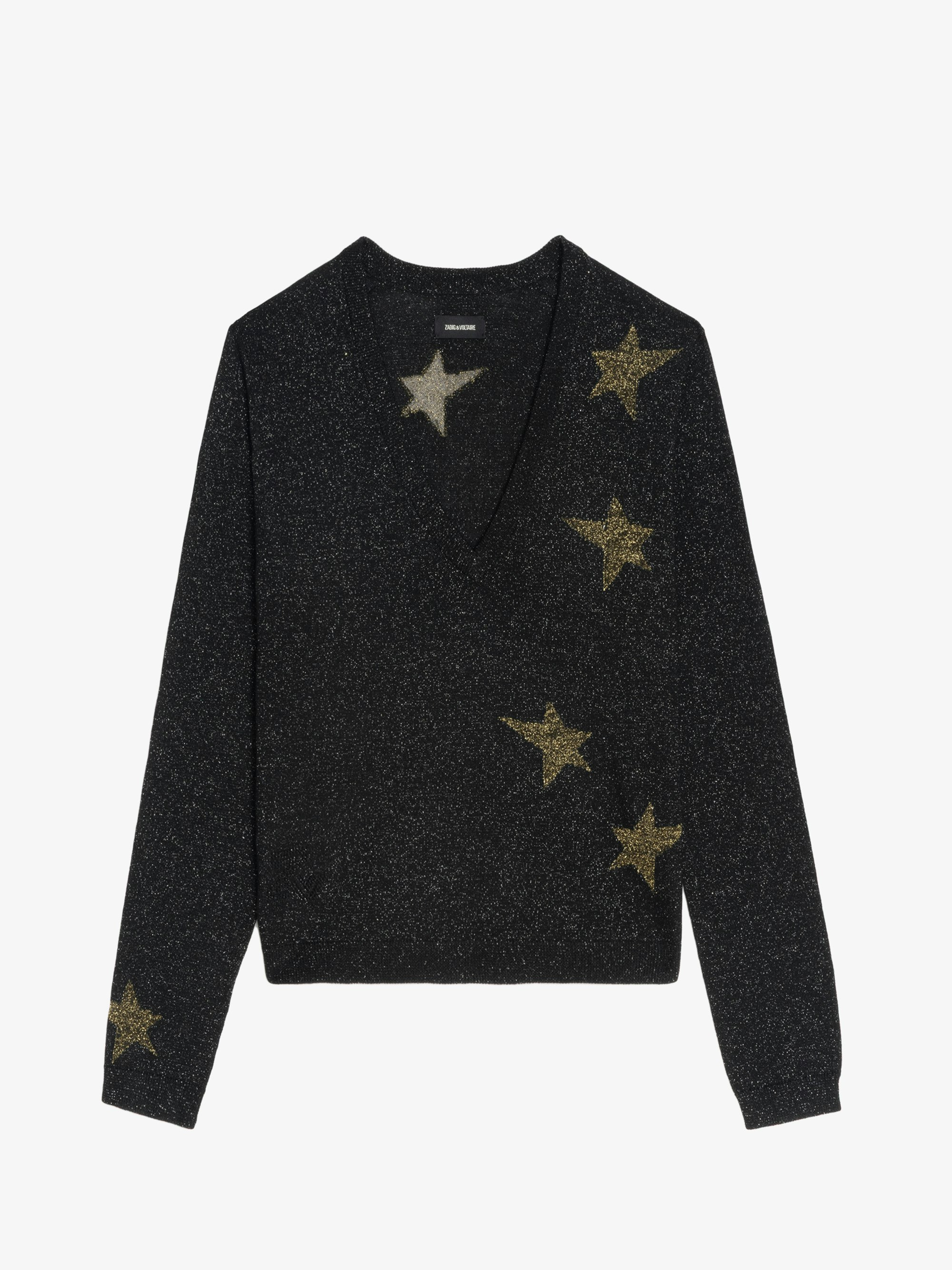 Luxury V-neck sweater with lurex intarsia stars. Description & details - Sweater in 100% merino wool - Star motif in intarsia and lurex - V-neck - Long sleeves Model is 177 cm / 5' 9" and is wearing a size S This item fits true to size. Choose your usual size. Composition 71% Wool* 25% Polyester 4% Metallic fiber Care - Hand-wash or machine-wash on a 20°C wool cycle with a maximum spin speed of 400 rpm - Do not wring - Air dry flat - Iron inside out at a maximum of 110°C, avoiding any customised details Product code: KWSW02846_BLACK