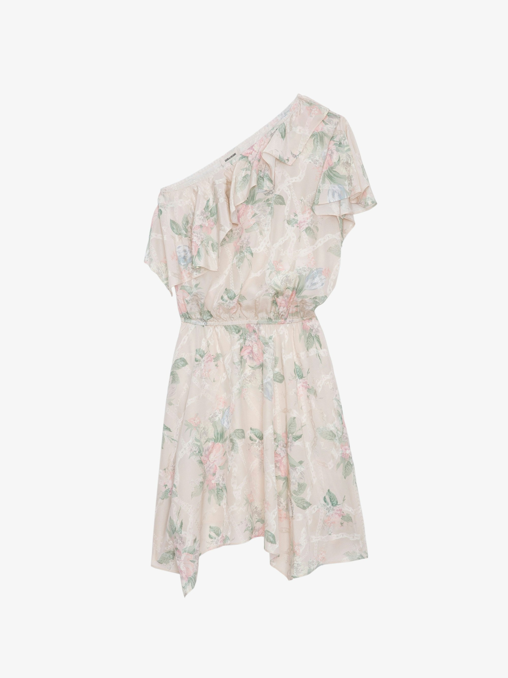 Women's ivory one shouldered dress with floral print. Description & details - Women's ivory one shouldered dress - All over floral print - Ruffles on sleeve - Asymmetrical hemline Model is 174 cm / 5' 8" and is wearing a size S This item is true to size. We recommend buying your usual size. Composition 100% SILK Product code: WWDR01340_MASTIC