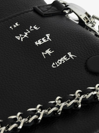 Graffiti-printed grained leather clutch with double chain in leather and metal, and wings adorned with rhinestones. Description & details - Women's Rock pouch in black grained leather - Metallic graffiti prints - Two removable metal chains intertwined with leather - Flap with zip and magnetic closure - Small zipped back pocket and interior patch pocket - Wings adorned with rhinestones - Can be carried by hand, on the shoulder, or cross-body 27 x 13 x 2 cm Composition 100% Cow leather Care - Protect your leather item from humidity and any source of heat (radiator, sun) - Avoid your item coming into contact with water - Regularly care for your leather item using a colourless nourishing cream for leather, suitable for leather goods - Ensure you wear your item with similar colours - Avoid overfilling your bag to ensure its durability - In case of stains, contact a leather professional Product code: LWBA03903_BLACK