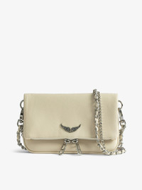 Clutch in grained leather with double leather and metal chains and wings adorned with rhinestones. Description & details - Clutch in grained leather - Two removable intertwined leather and metal chains - Flap with zip and magnetic closure - Small rear zip pocket and interior applied pocket - Signature wings adorned with rhinestones - Worn by hand, shoulder or cross-body - Can hold a mobile phone with a dimension of 6.1 inches or less (for example: can hold an iPhone and iPhone Pro 12/13/14/15/16 11 x 2 cm Composition 100% Cow leather Care - Protect your leather item from humidity and any source of heat (radiator, sun) - Avoid your item coming into contact with water - Regularly care for your leather item using a colourless nourishing cream for leather, suitable for leather goods - Ensure you wear your item with similar colours - Avoid overfilling your bag to ensure its durability - In case of stains, contact a leather professional Product code: LWBA03975_FLASH