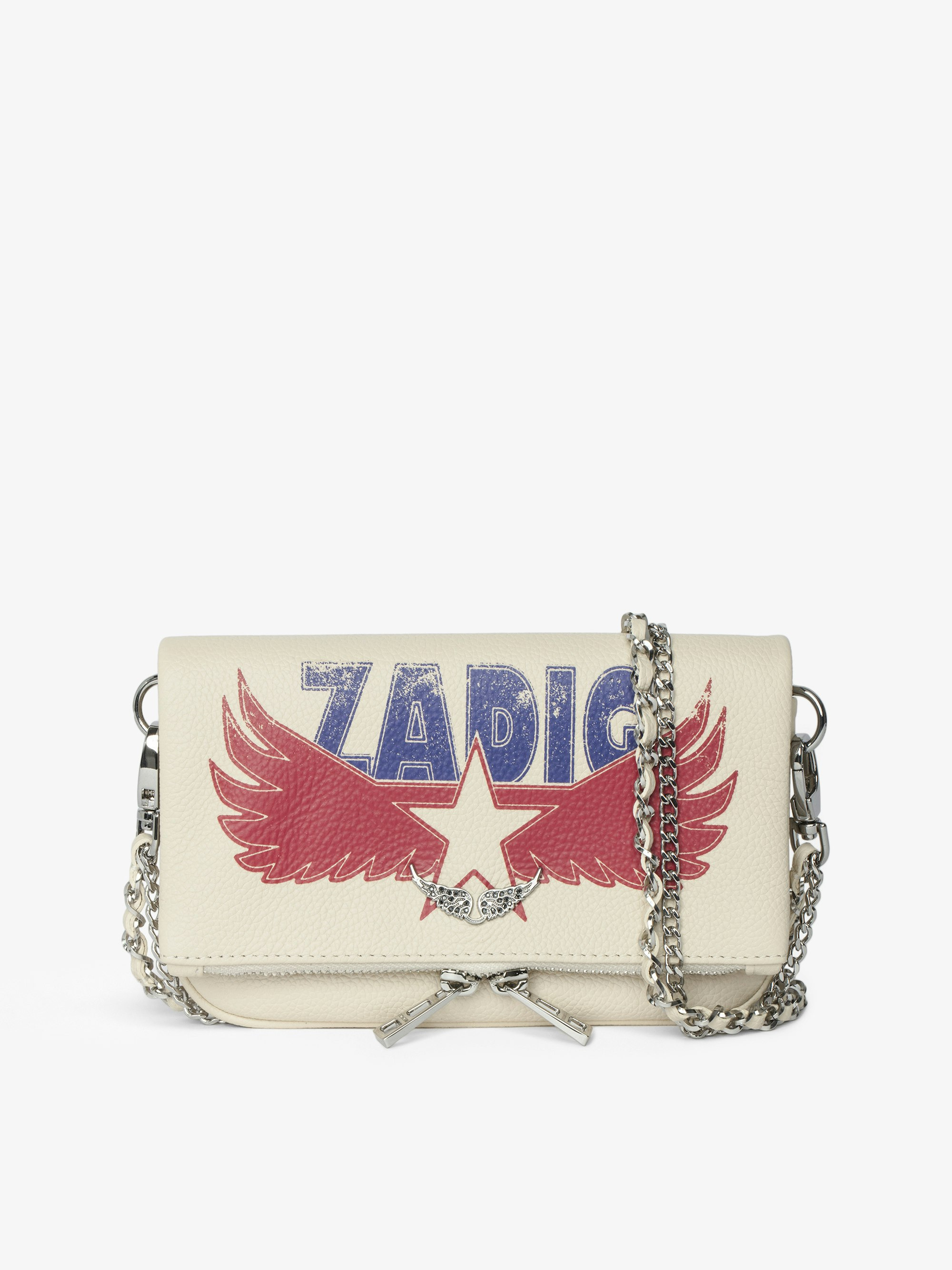 Grained leather pochette with double leather and metal chains and rhinestone-embellished wings. Description & details - Grained leather pochette - Star print - Two removable chains interwoven with leather and metal - Flap with zip and magnetic closure - Small zipped back pocket and interior patch pocket - Signature wings adorned with rhinestones - Can be carried by hand, shoulder or cross-body - Can hold a mobile phone with a dimension of 6.1 inches or less (e.g. can hold an iPhone 12/13/14/15/16) 19 x 11 x 2 cm Composition 100% Cow leather Care - Protect your leather item from humidity and any source of heat (radiator, sun) - Avoid your item coming into contact with water - Regularly care for your leather item using a colourless nourishing cream for leather, suitable for leather goods - Ensure you wear your item with similar colours - Avoid overfilling your bag to ensure its durability - In case of stains, contact a leather professional Product code: LWBA04039_FLASH