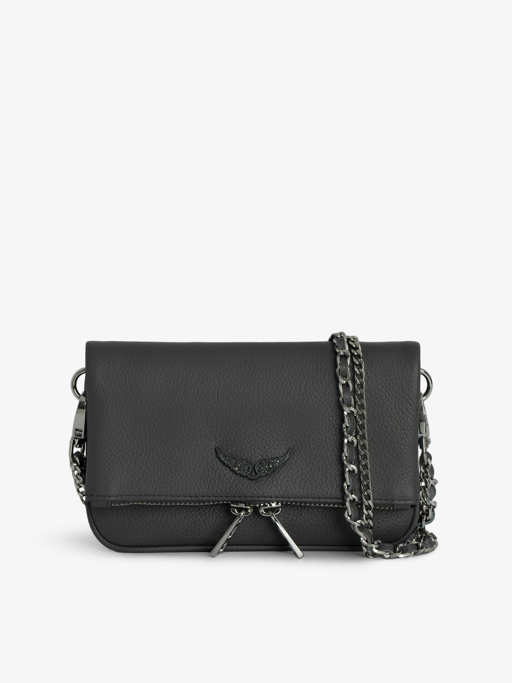 Small grained leather clutch with double chain and signature wings. Description & details - Women’s Rock Nano clutch in Road grey grained leather - Two removable chains, one interlaced with leather and the other in metal - Flap with magnetic fastening - Zipped pockets at the back and inside the flap - Lined - Wings embellished with diamante - Can be carried in the hand or worn on the shoulder or across the body 11 x 2 cm Composition 100% Cow leather Care - Protect your leather item from humidity and any source of heat (radiator, sun) - Avoid your item coming into contact with water - Regularly care for your leather item using a colourless nourishing cream for leather, suitable for leather goods - Ensure you wear your item with similar colours - Avoid overfilling your bag to ensure its durability - In case of stains, contact a leather professional Product code: LWBA03975_ROAD
