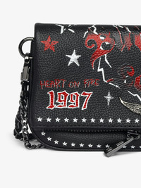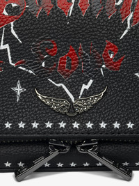 Punk grained leather clutch with double leather and metal chains and rhinestone-embellished wings. Description & details - Grained leather clutch - Punk design - Two removable chains, one interwoven with leather and the other in metal - Flap with zip and magnetic closure - Small zipped back pocket and inner flat pocket - Signature wings adorned with rhinestones - Can be carried by hand, shoulder or cross-body - Can hold a mobile phone with a dimension of 6.1 inches or less (for example: can hold an iPhone 12/13/14/15/16) 19 x 11 x 2 cm Composition 100% Cow leather Care - Protect your leather item from humidity and any source of heat (radiator, sun) - Avoid your item coming into contact with water - Regularly care for your leather item using a colourless nourishing cream for leather, suitable for leather goods - Ensure you wear your item with similar colours - Avoid overfilling your bag to ensure its durability - In case of stains, contact a leather professional Product code: LWBA04040_BLACK