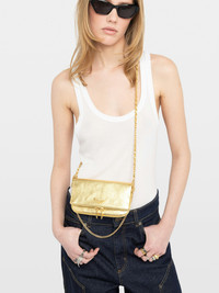 Pochette in metallic leather with signature wings embellished with rhinestones. Description & details - Pochette in metallic leather - Two detachable chains: one leather-woven, one metal - Magnetic flap closure - Back zip pocket - Signature wings embellished with rhinestones - Carried by hand, on the shoulder, or crossbody - Fits a smartphone up to 6.1 inches (e.g., fits an iPhone 12/13/14/15/16/17) 19 x 9 x 2 cm. Shoulder strap/chain height: 21 - 61 cm Composition 100% Cow leather Care - Protect your leather item from humidity and any source of heat (radiator, sun) - Avoid your item coming into contact with water - Regularly care for your leather item using a colourless nourishing cream for leather, suitable for leather goods - Ensure you wear your item with similar colours - Avoid overfilling your bag to ensure its durability - In case of stains, contact a leather professional Product code: LWBA04344_GOLD