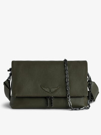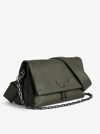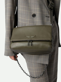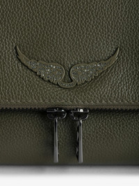 Women’s khaki grained leather bag with shoulder strap and wings signature. Description & details - Women’s Rocky bag in Record khaki grained leather - Black cotton lining - Removable adjustable leather shoulder strap and blackened metal chain - Tone-on-tone diamanté-embellished wings - Zip closure - Zip pocket at the back and several compartments, including a large inside zip compartment - Carry by hand, over the shoulder or across the body Width x Height x Depth: 27 x 16 x 12 cm. Adjustable shoulder strap: 70 cm - 115 cm. Chain strap drop: 29 cm Composition 100% COW LEATHER Care Do not expose your item to a source of heat or to sunlight for a prolonged period. In the event of accidental exposure to water, leave your item to dry at room temperature, away from direct light. Avoid routinely overloading your handbag or clutch. To prolong its life, store your item in a dust bag and pad it with tissue paper to maintain its shape. To maintain the shine of your smooth or grained leather item, use a leather cream or polish. Product code: LWBA00008_RECORD