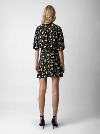 Women’s black floral-print silk dress with knot and draping at the waist. Description & details - Women’s fitted black midi dress - Floral-print silk - Shirt collar and deep neckline - Draping at the waist - Draped slit sleeves - Zip closure at the back - Short sleeves Model is 174 cm / 5' 8" and is wearing a size S This item is true to size. We recommend buying your usual size. Composition 100% VISCOSE Product code: WWDR01342_NOIR