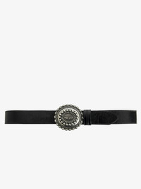 35mm wide belt in black vintage-effect leather with wing signature on western-style buckle. Description & details - Women's belt in black patent leather with vintage effect - Silver western-style buckle adorned with wing signature - Adjustable belt with 5 holes - Made in France 4 cm Composition 100% Cow leather Care - Protect your leather item from humidity and any source of heat (radiator, sun) - Avoid your item coming into contact with water - Regularly care for your leather item using a colourless nourishing cream for leather, suitable for leather goods - Ensure you wear your item with similar colours - Avoid overfilling your bag to ensure its durability - In case of stains, contact a leather professional Product code: LWBT00279_NOIR