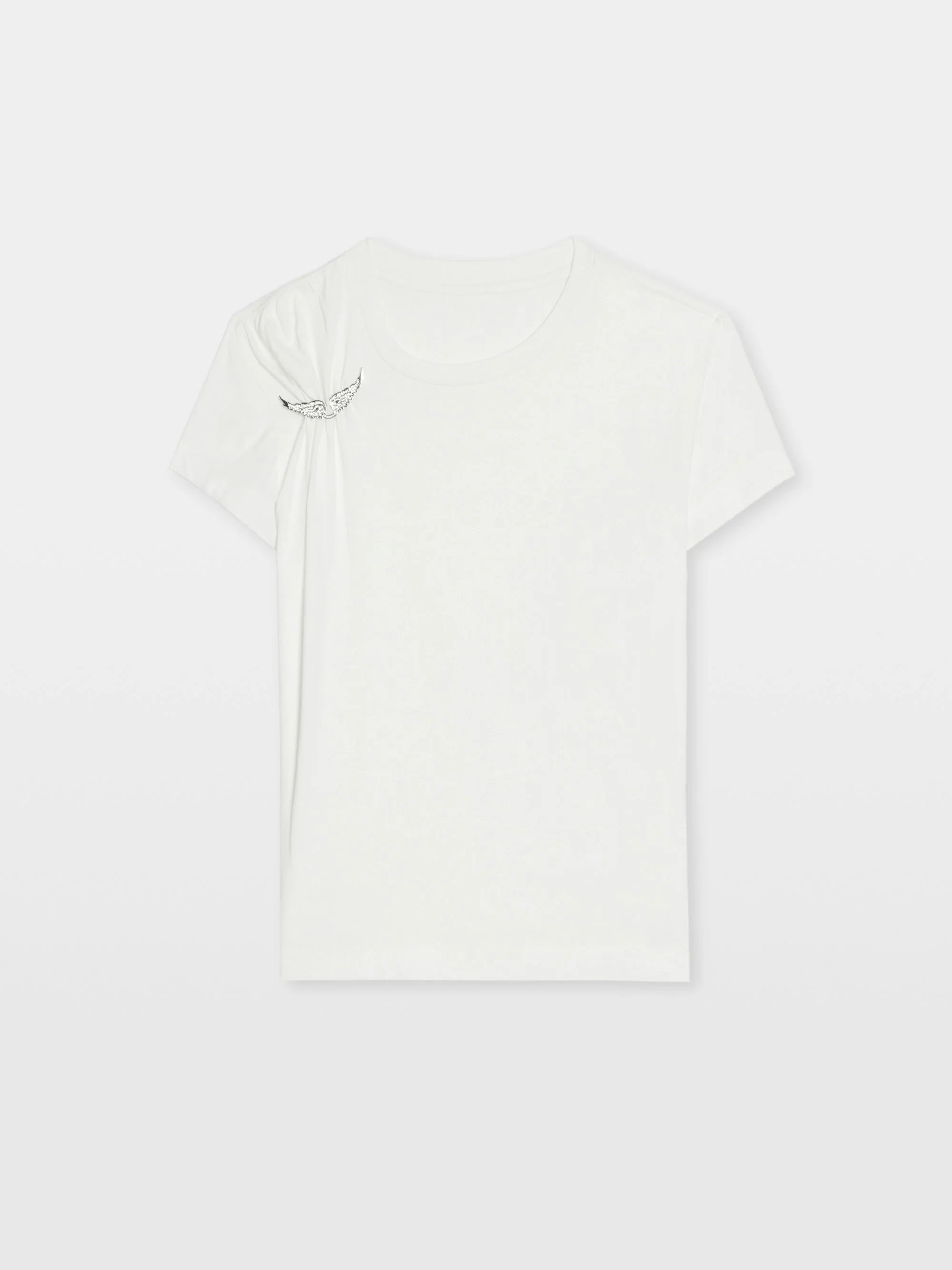 Pleated short-sleeve t-shirt with wing brooch. Description & details - 100% cotton t-shirt - Pleated fabric with decorative wing brooch at front - Crew neck - Short sleeves Model is 178 cm / 5' 10" and is wearing a size S This item fits true to size. Choose your usual size. Composition 100% Cotton* Care - Machine-wash inside out on a 30°C delicate cycle with similar colours - Air dry - Iron inside out at a maximum of 110°C, avoiding any customised details Product code: JWTS02871_JUDO