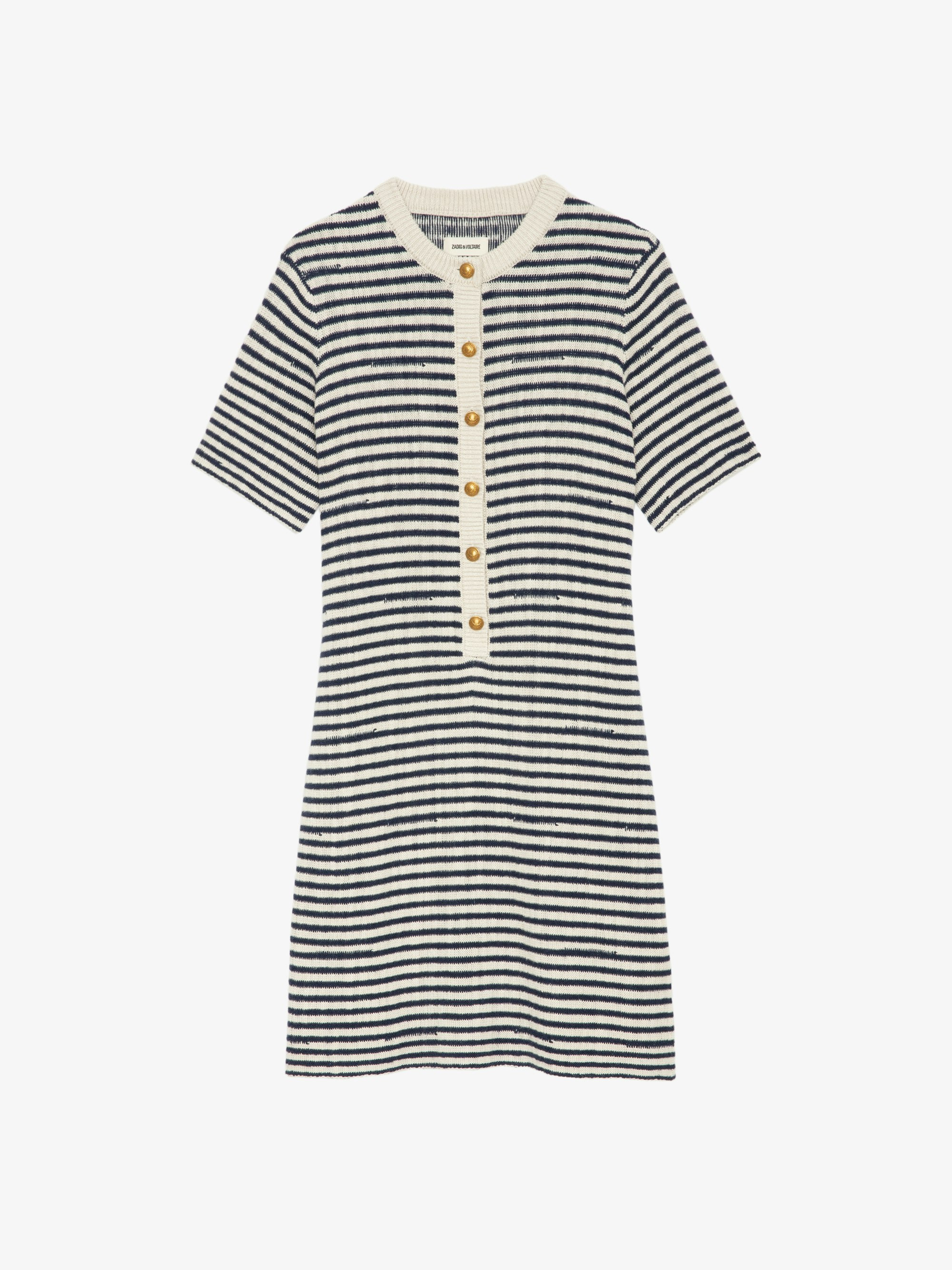 A chic fusion of nautical inspiration and contemporary style. This short-sleeved sailor dress features a refined buttoned collar, exuding a timeless elegance that seamlessly aligns with the brand's modern aesthetic. Crafted in a deep encre striped print, the Tahoe Dress is perfect for the fashion-forward woman seeking a versatile piece that transitions effortlessly from day to night. Description & details - Short sailor dress - Striped print - Buttoned round collar - Short sleeves Model is 171 cm / 5' 7" and is wearing a size S This item is true to size. We recommend buying your usual size. Composition 56% Cotton* 23% Viscose 13% Linen 5% Polyester 3% Metallic fiber Care - Hand-wash or machine-wash on a 20°C wool cycle with a maximum spin speed of 400 rpm - Do not wring - Air dry flat - Iron inside out at a maximum of 110°C, avoiding any customised details Product code: KWDR01189_ENCRE