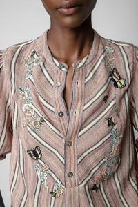 Women's pink striped cotton blouse with floral embroidery Description & details The Teda striped blouse has a round buttoned neckline and long sleeves, and features a delicately embroidered plastron. - Zadig&Voltaire women’s Japon pink striped cotton blouse - Embroidered flowers and butterflies - Round neck - Placket - Long sleeves - Buttoned cuffs - Model is 5' 10" and is wearing a size S - Made in India - Product code: WWSH00492_JAPON Model is 178 cm / 5' 10" and is wearing a size S This item is true to size. We recommend buying your usual size. Composition 100% Cotton* Care Hand-wash or machine-wash your garment at a maximum of 20 °C, in a mesh laundry bag and inside out, with a gentle spin cycle. Air-dry. Iron your garment on a low heat setting or steam from a distance of 20 cm, being particularly careful with customised details. Product code: WWSH00492_JAPON