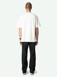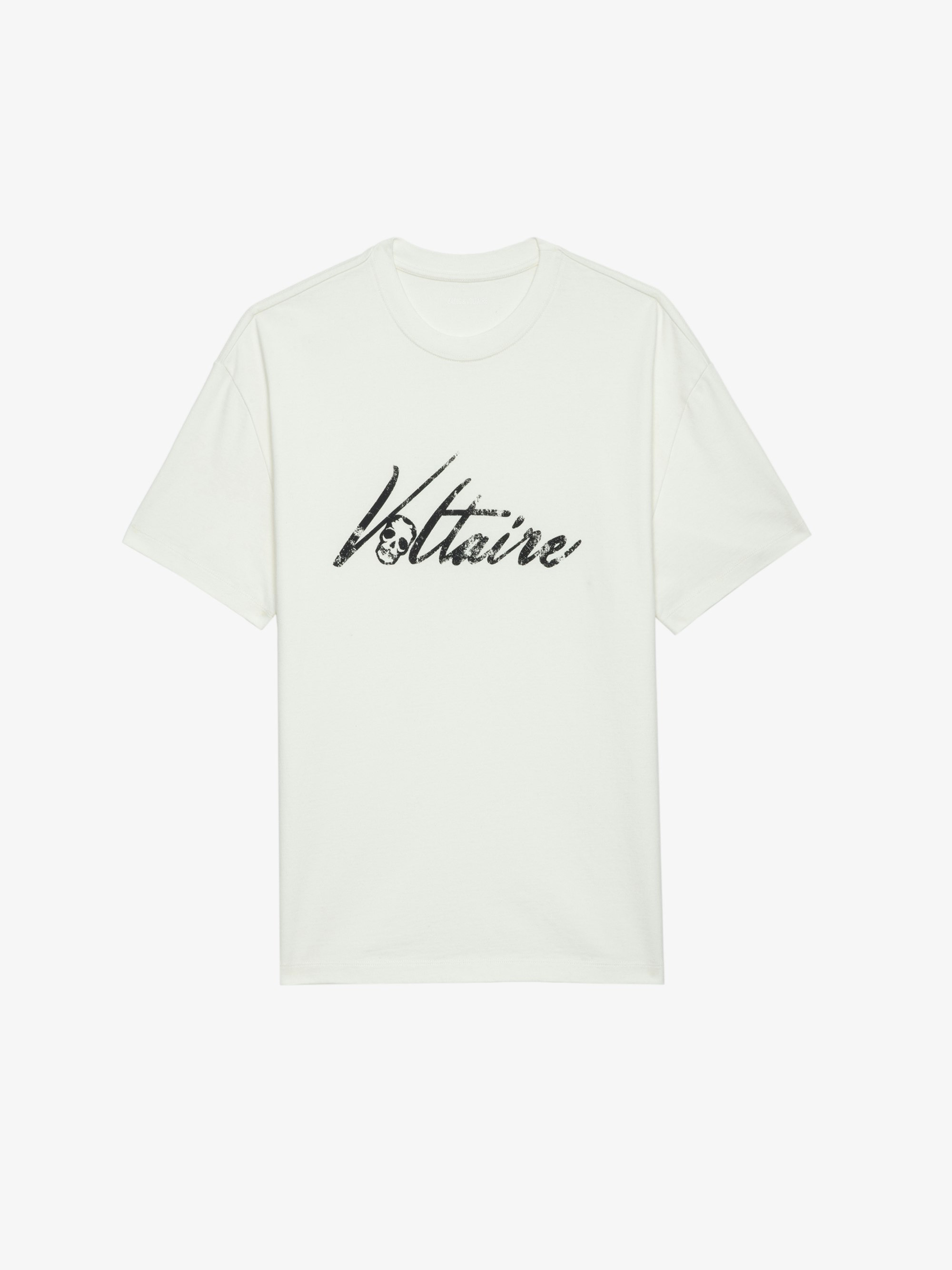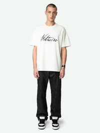 Ecru oversized t-shirt in organic cotton with short sleeves and "Voltaire" print. Description & details - Oversized ecru organic cotton Judo T-shirt for men - "Voltaire" print - Round neckline - Short-sleeved - Made in Portugal Model is 184 cm / 6' 0" and is wearing a size M This item has a loose fit. For a more fitted look, choose one size down from your usual size. Composition 100% Cotton* Care - Machine-wash inside out on a 30°C delicate cycle with similar colours - Air dry - Iron inside out at a maximum of 110°C, avoiding any customised details Product code: JMTS01718_JUDO