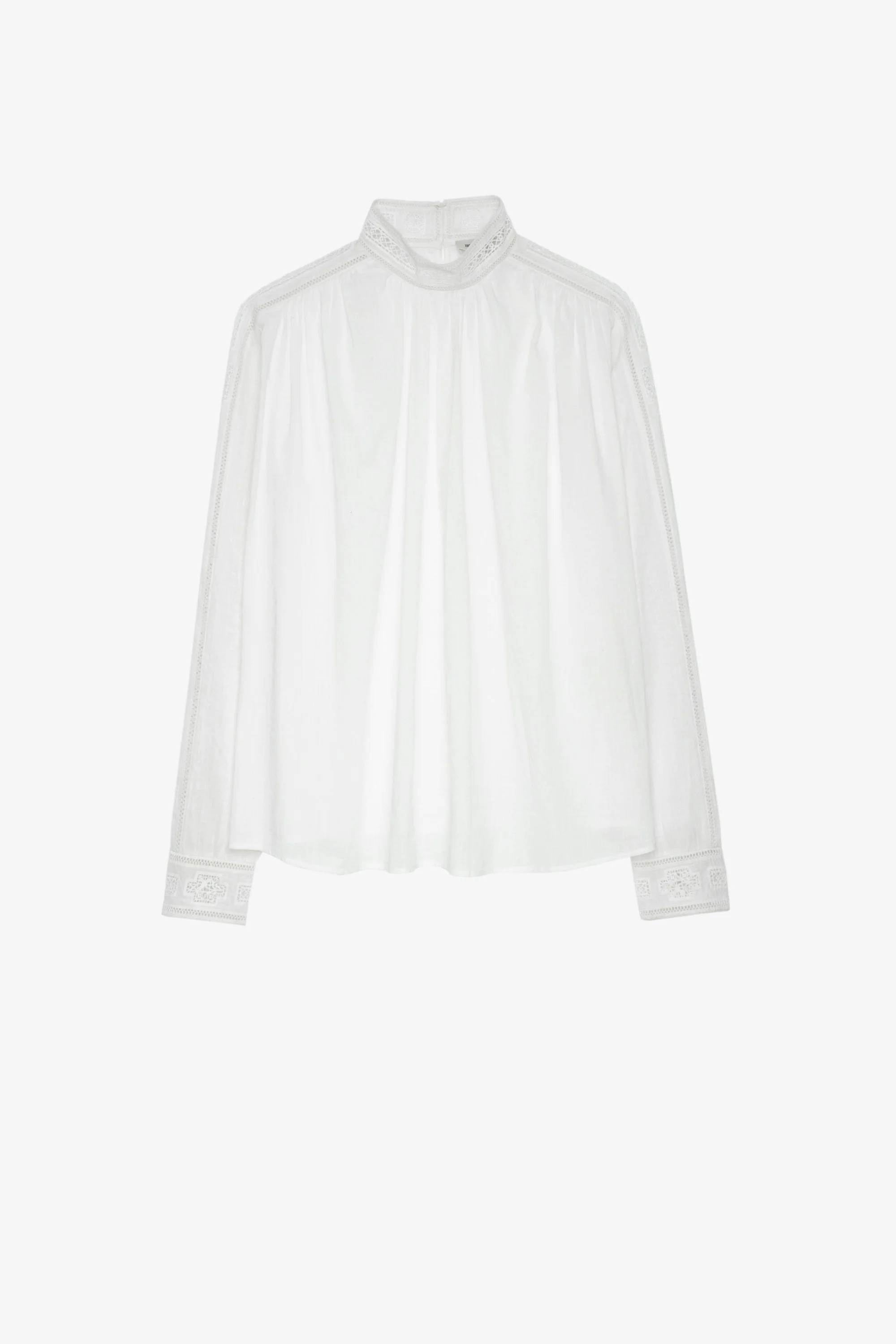 Women's white cotton top. Description & details Bohemian and chic, the Teddy top features a high neckline and cutout detailing along the collar and sleeves. - Zadig&Voltaire women's shirt in white cotton - Buttoned - Long sleeves - cutout trims Composition 100% Cotton Product code: WWSH00036_JUDO
