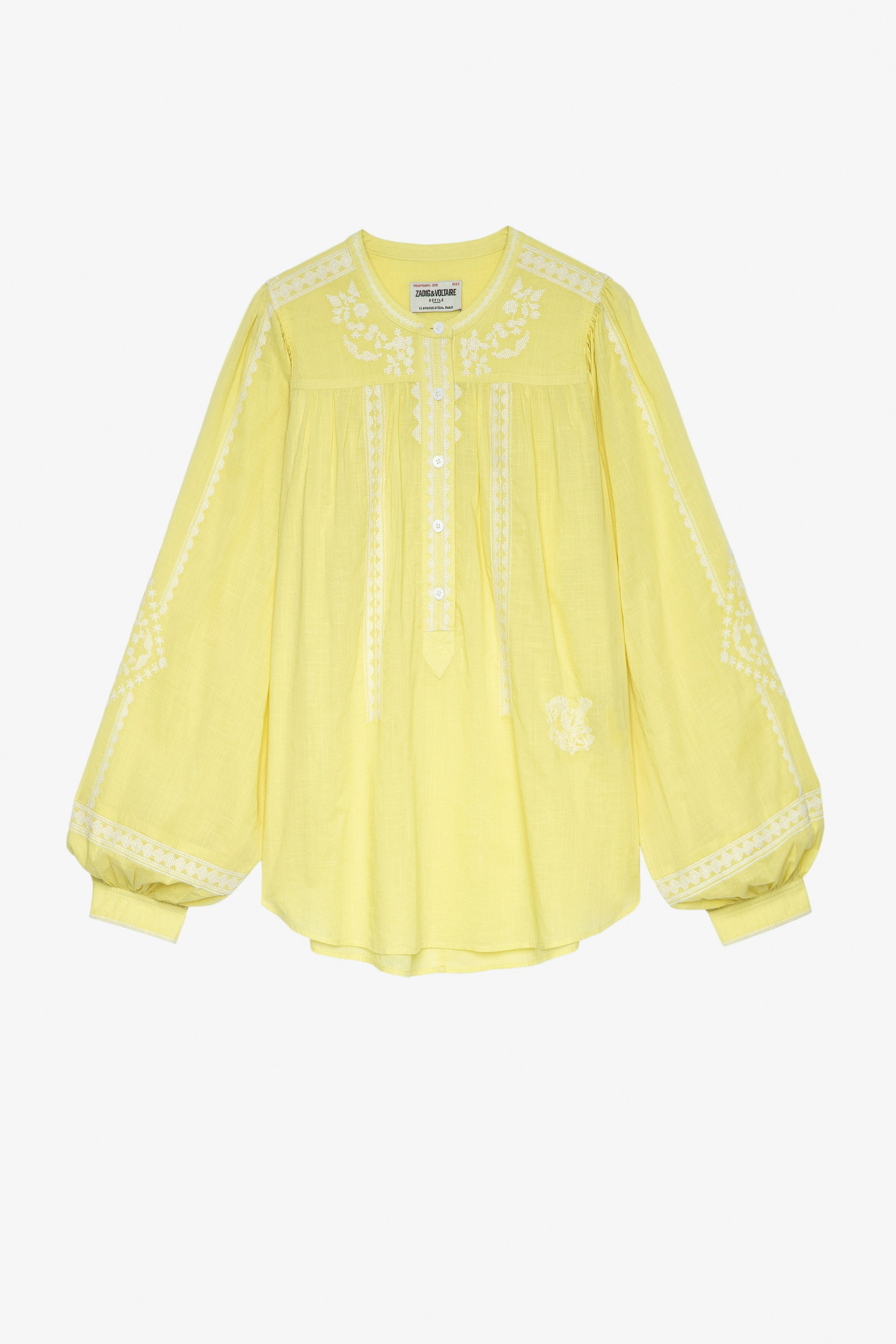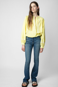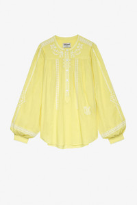 Women's embroidered and gathered yellow cotton shirt Description & details The Tigy cotton shirt features embroidered and gathered details with a round button-down neckline and voluminous sleeves. - Zadig&Voltaire women's Zeste yellow cotton shirt - Long sleeves - Gathered - Round neckline - Button placket - Buttoned cuffs - Product code: WWSH00498_ZESTE - The GOTS certification guarantees that this product does not contain GMOs. It also ensures the absence of harmful substances in the product, a social and environmental responsible management and the end-to-end traceability of the supply chain. The dyes are made with GOTS approved inks and colorants, which do not contain toxic heavy metals and do not require aromatic solvents nor harmful substances. Model is 175 cm / 5' 8" and is wearing a size S This item is true to size. We recommend buying your usual size. Composition 100% Cotton** Care Hand-wash or machine-wash your garment at a maximum of 20 °C, in a mesh laundry bag and inside out, with a gentle spin cycle. Air-dry. Iron your garment on a low heat setting or steam from a distance of 20 cm, being particularly careful with customised details. Product code: WWSH00498_ZESTE