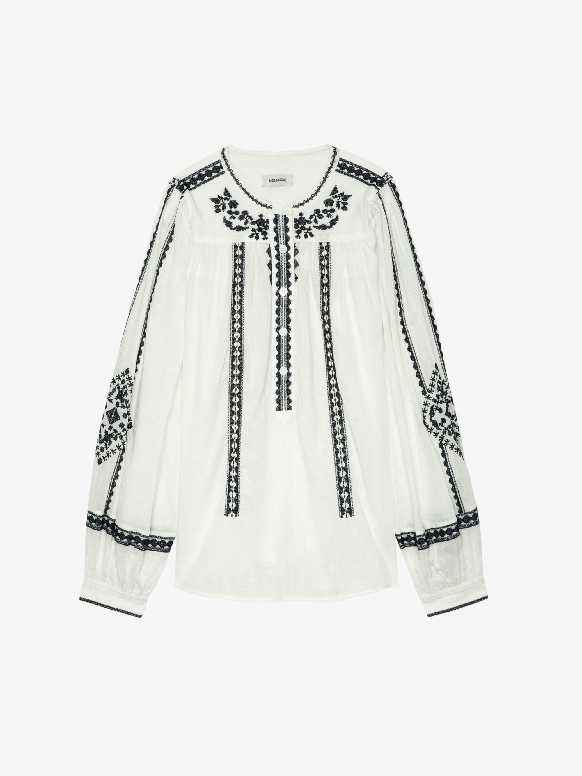 A harmonious blend of bohemian charm and contemporary elegance. This oversized cotton blouse features intricate kozak embroidery and long sleeves, exuding a free-spirited allure that is both timeless and modern. Description & details - Oversized cotton blouse - Kozak embroidery - Buttoned round collar - Gathered details and pleats at the back - Long sleeves and buttoned cuffs Model is 171 cm / 5' 7" and is wearing a size S This item is true to size. We recommend buying your usual size. Composition 100% Cotton** Care Hand-wash or machine-wash your garment at a maximum of 20 °C, in a mesh laundry bag and inside out, with a gentle spin cycle. Air-dry. Iron your garment on a low heat setting or steam from a distance of 20 cm, being particularly careful with customised details. Product code: WWSH00498_JUDO
